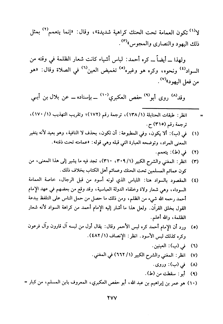 (¬4) المقصود بالسواد هنا: اللباس الذي لونه أسود من قبل الرجال، خاصة العمامة السوداء، وهي شعار ولاة وخلفاء الدولة العباسية، وقد وقع من بعضهم في عهد الإمام أحمد رحمه الله شيء من الظلم، ومن ذلك ما حصل من حمل الناس على التلفظ ببدعة القول بخلق القرآن. ولعل هذا ما أشار إليه الإمام أحمد من كراهة السواد؛ لأنه شعار الظلمة، والله أعلم.
