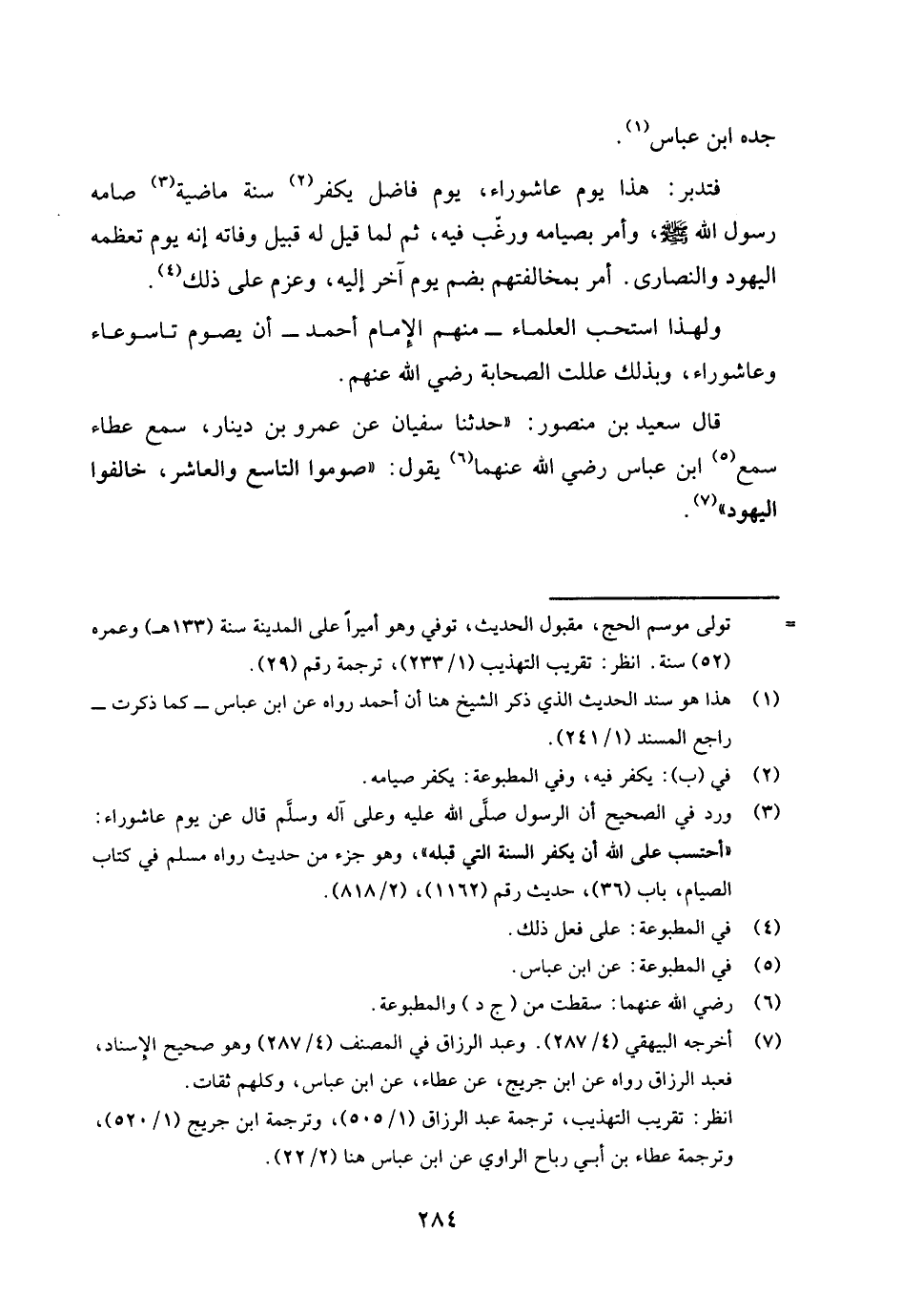 ولهذا استحب العلماء منهم الإمام أحمد أن يصوم تاسوعاء وعاشوراء، وبذلك عللت الصحابة رضي الله عنهم.