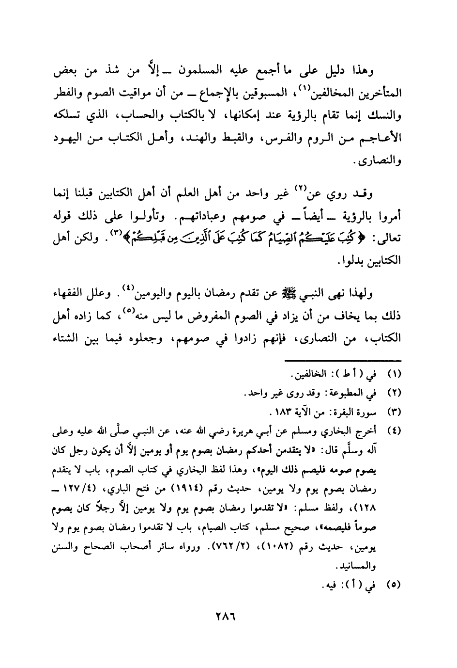 وهذا: دليل على ما أجمع عليه المسلمون- إلا من شذ من بعض المتأخرين المخالفين (¬1) المسبوقين بالإجماع- من أن مواقيت الصوم والفطر والنسك إنما تقام بالرؤية عند إمكانها، لا بالكتاب والحساب، الذي تسلكه الأعاجم من الروم والفرس، والقبط، والهند، وأهل الكتاب من اليهود والنصارى.