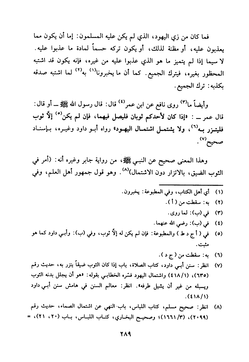 (¬7) انظر: سنن أبي داود، كتاب الصلاة، باب إذا كان الثوب ضيقا يتزر به، حديث رقم (635) ، (1 / 418) واشتمال اليهود فسَّره الخطابي بقوله: " هو أن يجلل بدنه الثوب ويسبله من غير أن يشيل طرفه ". انظر: معالم السنن في هامش سنن أبي داود (1 / 418) .