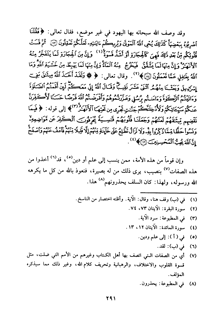 (¬7) أي من الصفات التي اتصف بها أهل الكتاب وغيرهم من الأمم التي ضلت، مثل قسوة القلوب والاختلاف، والرهبانية وتحريف كلام الله، وغير ذلك مما سيذكره المؤلف.