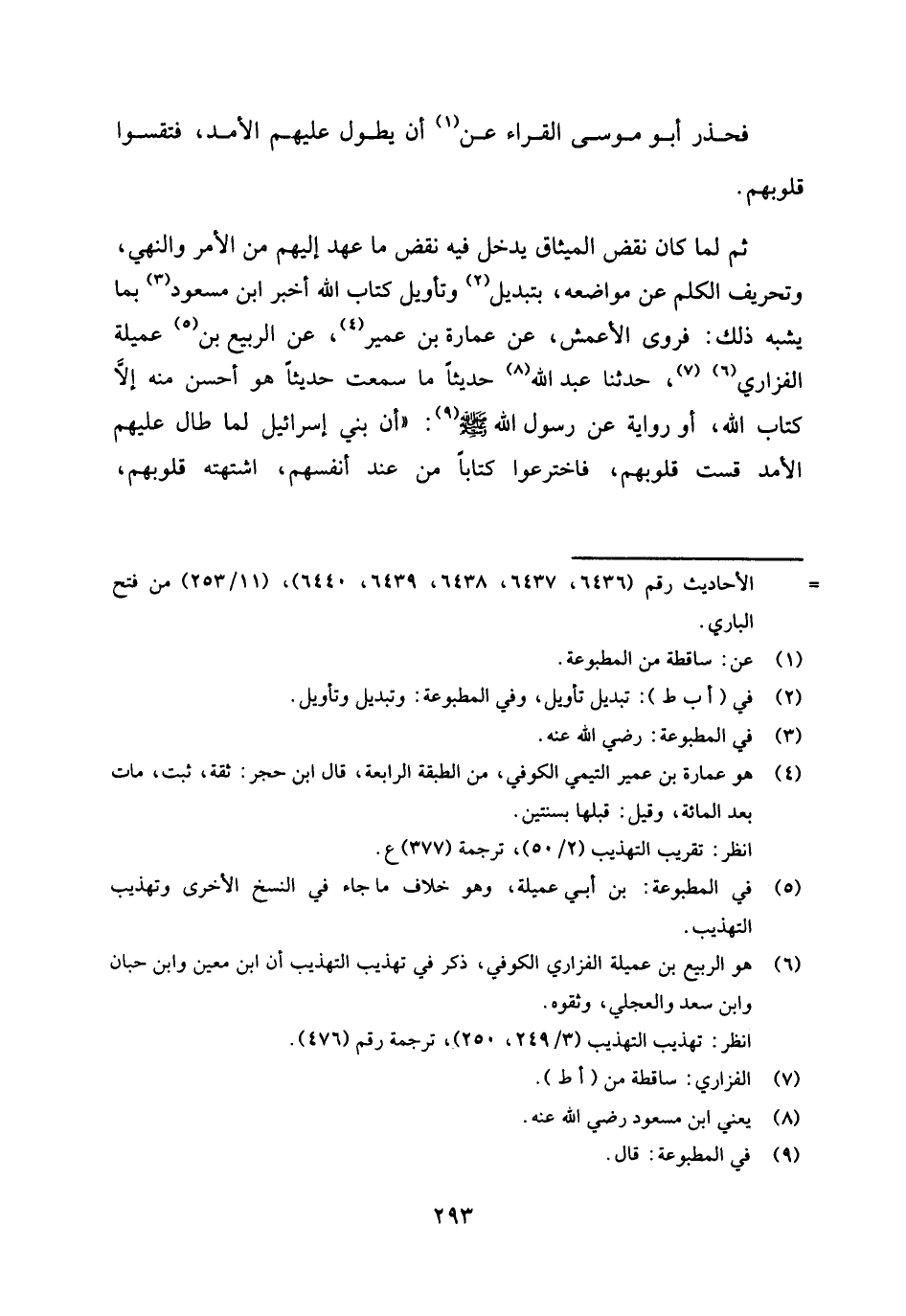 فروى الأعمش، عن عمارة بن عمير (¬4) عن الربيع بن (¬5) عميلة الفزاري (¬6) حدثنا عبد الله (¬7) حديثا ما سمعت حديثا هو أحسن منه إلا كتاب الله، أو رواية عن رسول الله صلى الله عليه وسلم: (¬8) «إن بني إسرائيل لما طال عليهم الأمد قست قلوبهم، فاخترعوا كتابا من عند أنفسهم، اشتهته قلوبهم،