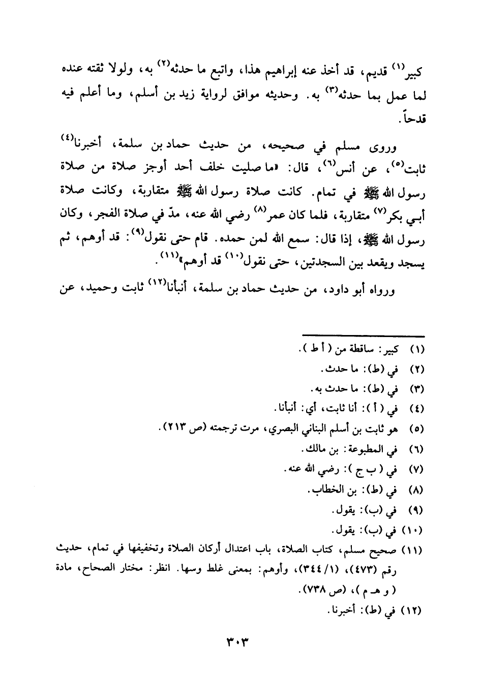وروى مسلم في صحيحه، من حديث حماد بن سلمة، أخبرنا (¬4) ثابت (¬5) عن أنس (¬6) قال: " ما صليت خلف أحد أوجز صلاة من صلاة رسول الله صلى الله عليه وسلم في تمام، كانت صلاة رسول الله صلى الله عليه وسلم متقاربة، وكانت صلاة أبي بكر رضي الله عنه (¬7) متقاربة، فلما كان عمر (¬8) رضي الله عنه، مد في صلاة الفجر، وكان رسول الله صلى الله عليه وسلم، إذا قال: سمع الله لمن حمده، قام حتى نقول: (¬9) قد أوهم، ثم يسجد ويقعد بين السجدتين، حتى نقول: (¬10) قد أوهم " (¬11) .