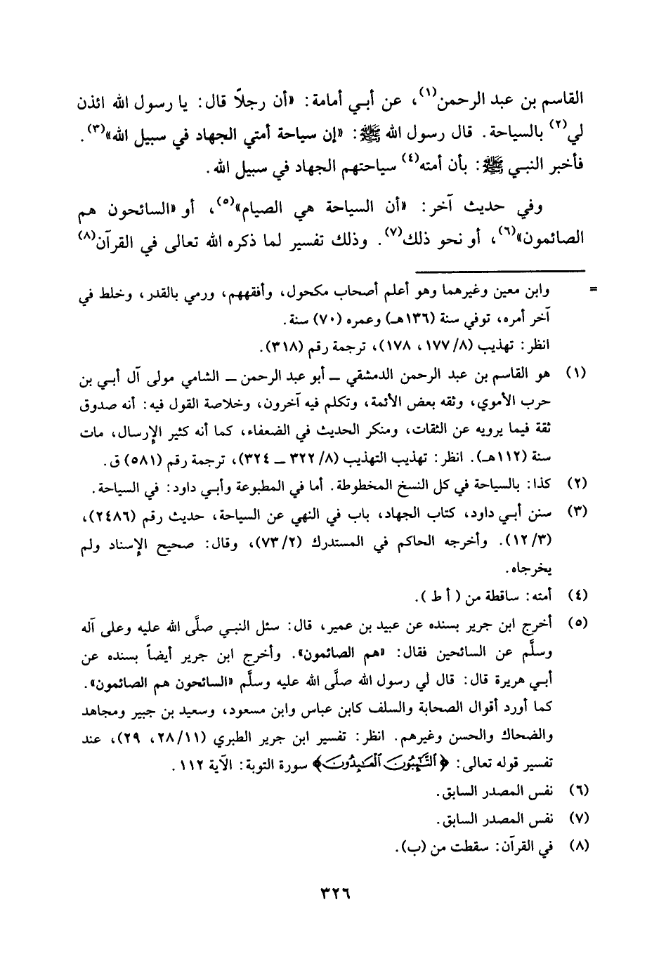 (¬5) أخرج ابن جرير بسنده عن عبيد بن عمير، قال: سئل النبي صلى الله عليه وعلى آله وسلم عن السائحين فقال: " هم الصائمون ". وأخرج ابن جرير أيضا بسنده عن أبي هريرة قال: قال لي رسول الله صلى الله عليه وسلم: " السائحون هم الصائمون ". كما أورد أقوال الصحابة والسلف كابن عباس وابن مسعود، وسعيد بن جبير ومجاهد والضحاك والحسن وغيرهم. انظر: تفسير ابن جرير الطبري (11 / 28، 29) ، عند تفسير قوله تعالى: " التائبون العابدون " سورة التوبة: الآية 112.