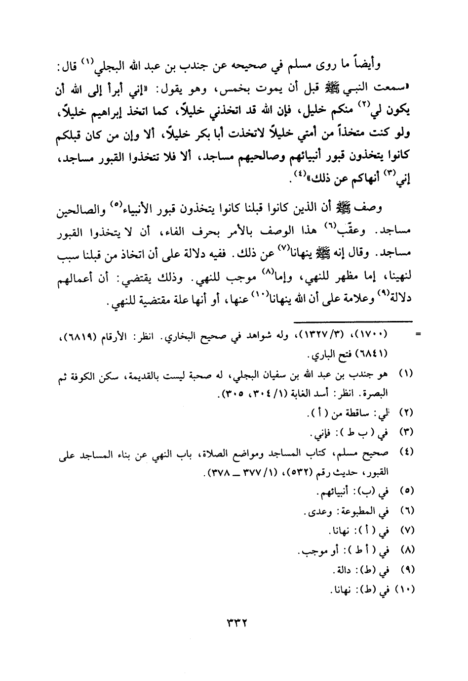 وأيضا ما روى مسلم في صحيحه عن جندب بن عبد الله البجلي (¬1) قال: سمعت النبي صلى الله عليه وسلم قبل أن يموت بخمس، وهو يقول: «إني أبرأ إلى الله أن يكون لي (¬2) منكم خليل، فإن الله قد اتخذني خليلا، كما اتخذ إبراهيم خليلا، ولو كنت متخذا من أمتي خليلا لاتخذت أبا بكر خليلا، ألا وإن من كان قبلكم كانوا يتخذون قبور أنبيائهم وصالحيهم مساجد، ألا فلا تتخذوا القبور مساجد إني (¬3) أنهاكم عن ذلك» (¬4) .