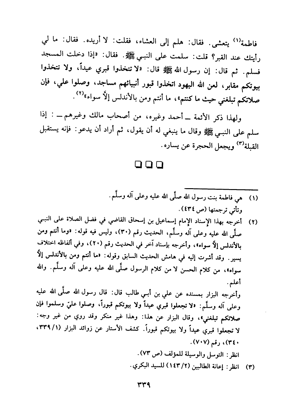 فاطمة (¬1) يتعشى، فقال: هلم إلى العشاء، فقلت: لا أريده، فقال: مالي رأيتك عند القبر؟ قلت: سلمت على النبي صلى الله عليه وسلم، فقال: " إذا دخلت المسجد فسلم. ثم قال: إن رسول الله صلى الله عليه وسلم قال: «لا تتخذوا قبري عيدا، ولا تتخذوا بيوتكم مقابر، لعن الله اليهود اتخذوا قبور أنبيائهم مساجد، وصلوا علي، فإن صلاتكم تبلغني حيثما كنتم» ، ما أنت ومن بالأندلس إلا سواء " (¬2) .