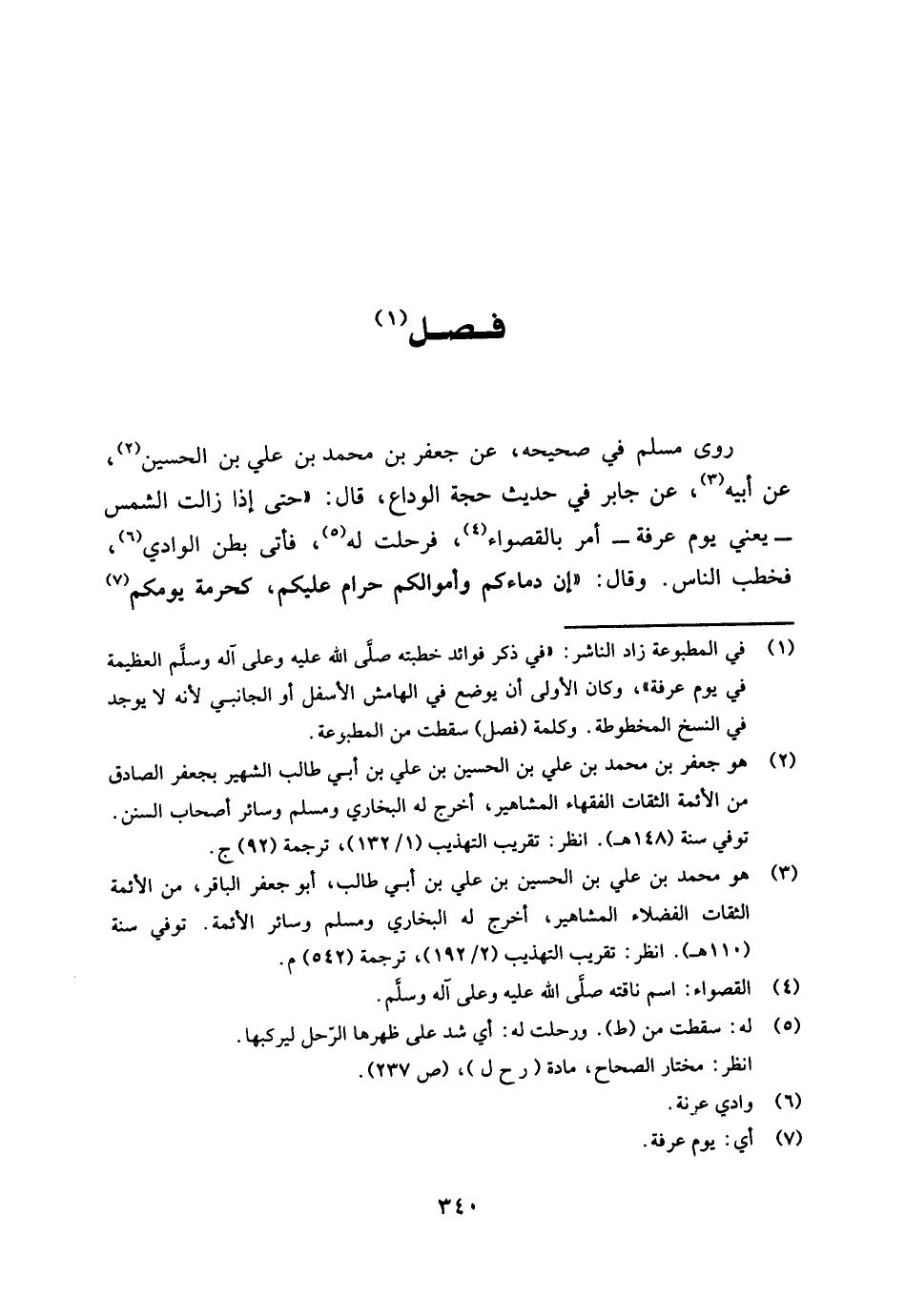 فصل (¬1) روى مسلم في صحيحه، عن جعفر بن محمد بن علي بن الحسين (¬2) عن أبيه (¬3) عن جابر في حديث حجة الوداع، قال: " حتى إذا زالت الشمس - يعني يوم عرفة - أمر بالقصواء (¬4) فرحلت له (¬5) فأتى بطن الوادي (¬6) فخطب الناس وقال: «إن دماءكم وأموالكم حرام عليكم كحرمة يومكم (¬7)