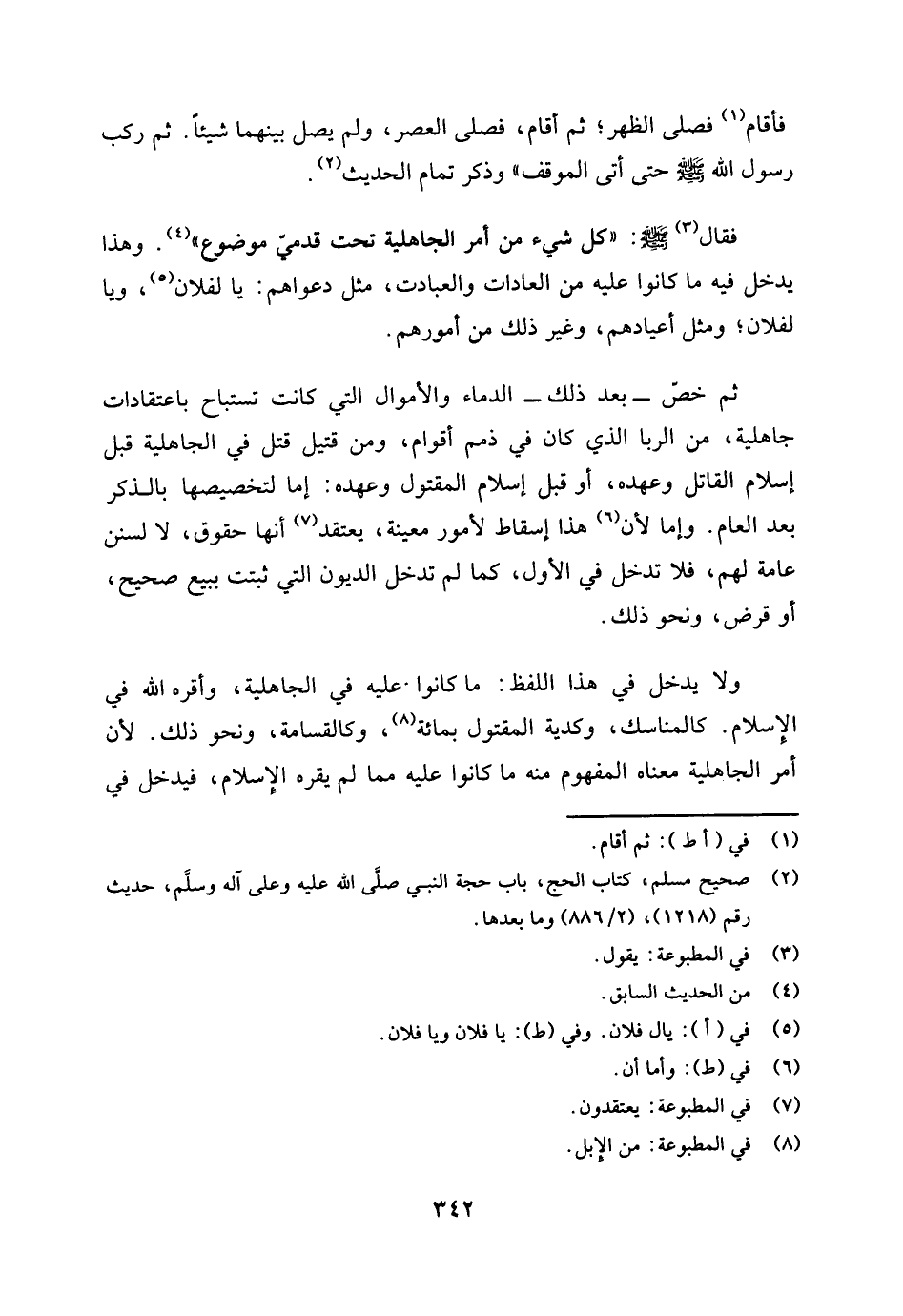 ثم خص - بعد ذلك - الدماء والأموال التي كانت تستباح باعتقادات جاهلية، من الربا الذي كان في ذمم أقوام، ومن قتيل قتل في الجاهلية قبل إسلام القاتل وعهده، أو قبل إسلام المقتول وعهده: إما لتخصيصها بالذكر بعد العام، وإما لأن (¬6) هذا إسقاط لأمور معينة، يعتقد (¬7) أنها حقوق، لا لسنن عامة لهم، فلا تدخل في الأول، كما لم تدخل الديون التي ثبتت ببيع صحيح، أو قرض، ونحو ذلك.