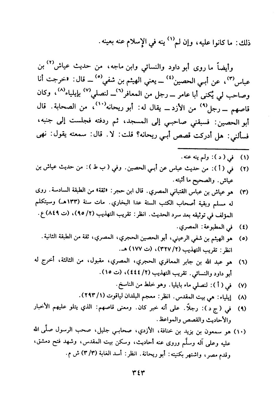 وأيضا ما روى أبو داود والنسائي وابن ماجه، من حديث عياش (¬2) بن عباس (¬3) عن أبي الحصين (¬4) - يعني الهيثم بن شفي (¬5) - قال: " خرجت أنا وصاحب لي يُكنى أبا عامر - رجل من المعافر (¬6) - لنصلي (¬7) بإيلياء (¬8) وكان قاصهم رجل (¬9) من الأزد يقال له: أبو ريحانة (¬10) من الصحابة. قال أبو الحصين: فسبقني صاحبي إلى المسجد، ثم ردفته فجلست إلى جنبه، فسألني: هل أدركت قصص أبي ريحانة؟ قلت: لا. قال: سمعته يقول: نهى