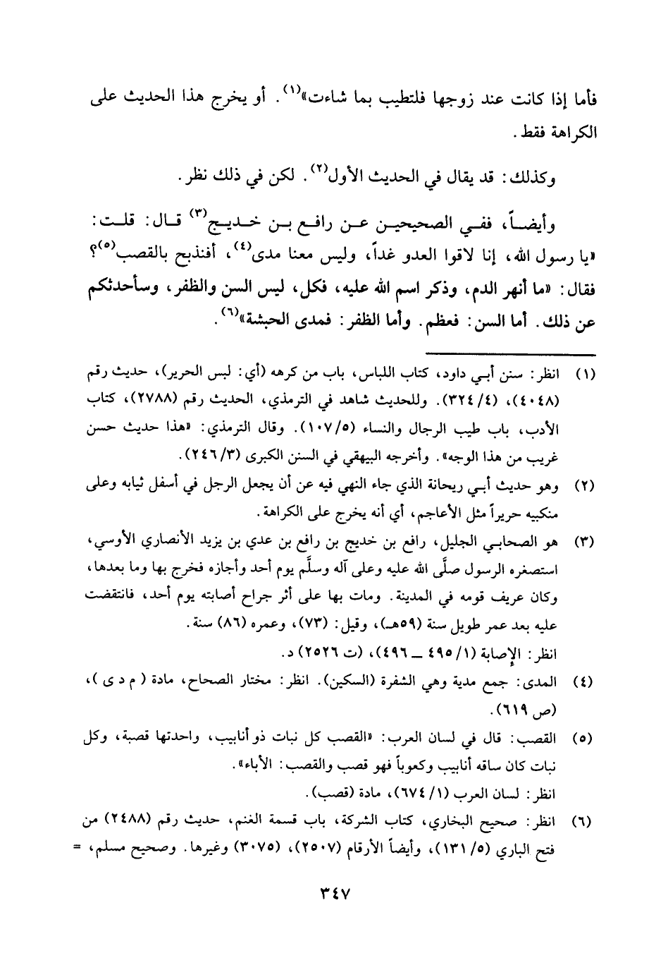 (¬6) انظر: صحيح البخاري، كتاب الشركة، باب قسمة الغنم، حديث رقم (2488) من فتح الباري (5 / 131) ، وأيضا الأرقام (2507) ، (3075) وغيرها. وصحيح مسلم، كتاب الأضاحي، باب جواز الذبح بكل ما أنهر الدم، إلا السن والظفر وسائر العظام، حديث رقم (1968) ، (3 / 1558) .