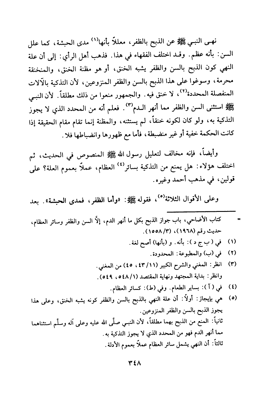(¬5) هي بإيجاز: أولا: أن علة النهي بالذبح بالسن والظفر كونه يشبه الخنق، وعلى هذا يجوز الذبح بالسن والظفر المنزوعين.