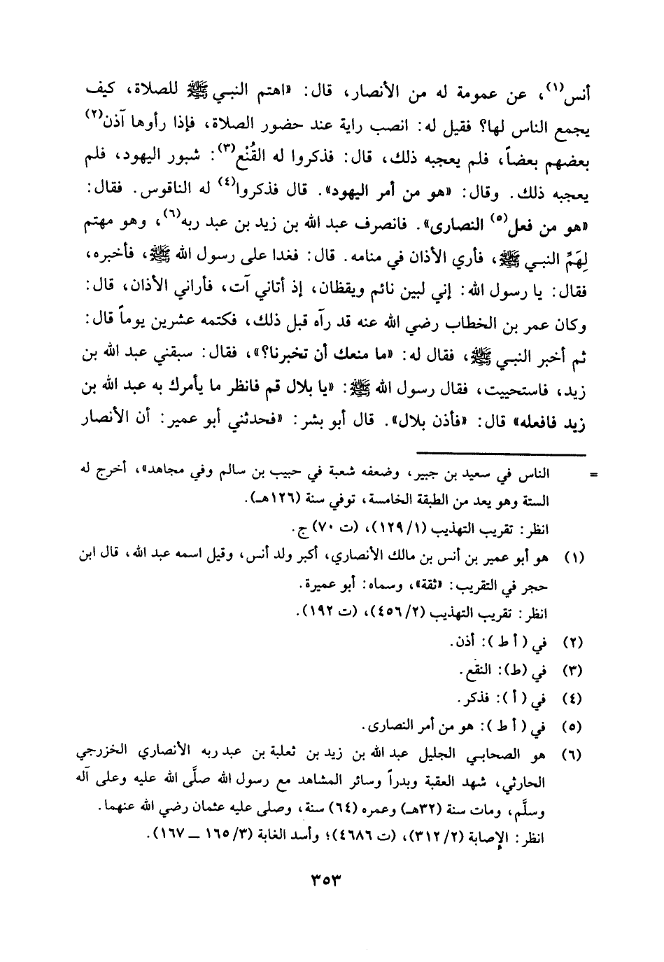(¬6) هو الصحابي الجليل: عبد الله بن زيد بن ثعلبة بن عبد ربه الأنصاري الخزرجي الحارثي، شهد العقبة وبدرا وسائر المشاهد مع رسول الله صلى الله عليه وعلى آله وسلم، ومات سنة (32هـ) وعمره (64) سنة، وصلى عليه عثمان، رضي الله عنهما.