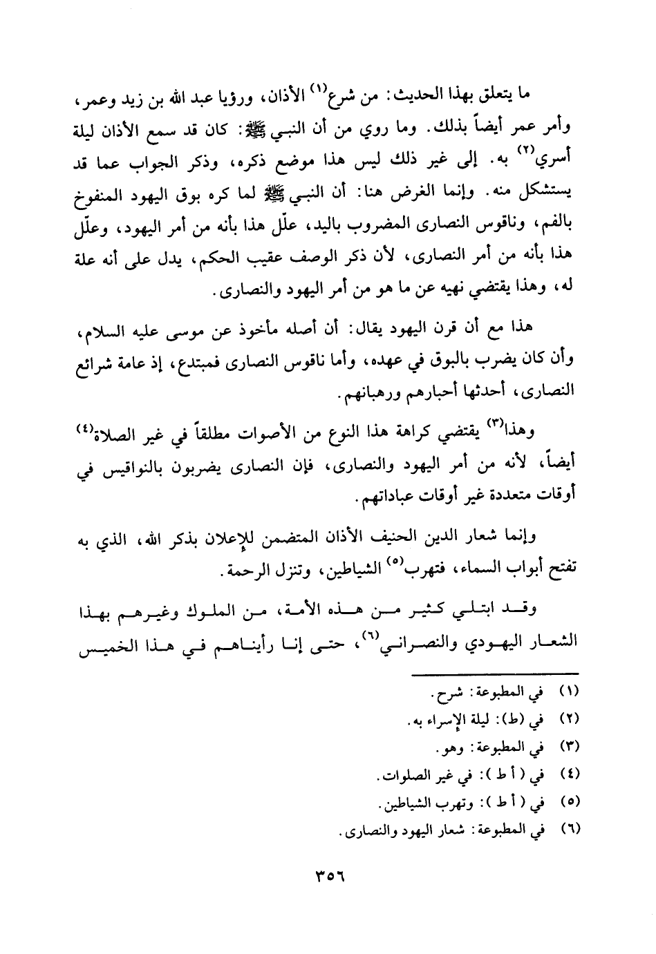 وإنما الغرض هنا: أن النبي صلى الله عليه وسلم لما كره بوق اليهود المنفوخ بالفم، وناقوس النصارى المضروب باليد، علل هذا بأنه من أمر اليهود، وعلل هذا بأنه من أمر النصارى؛ لأن ذكر الوصف عقيب الحكم، يدل على أنه علة له، وهذا يقتضي نهيه عن كل ما هو من أمر اليهود والنصارى.