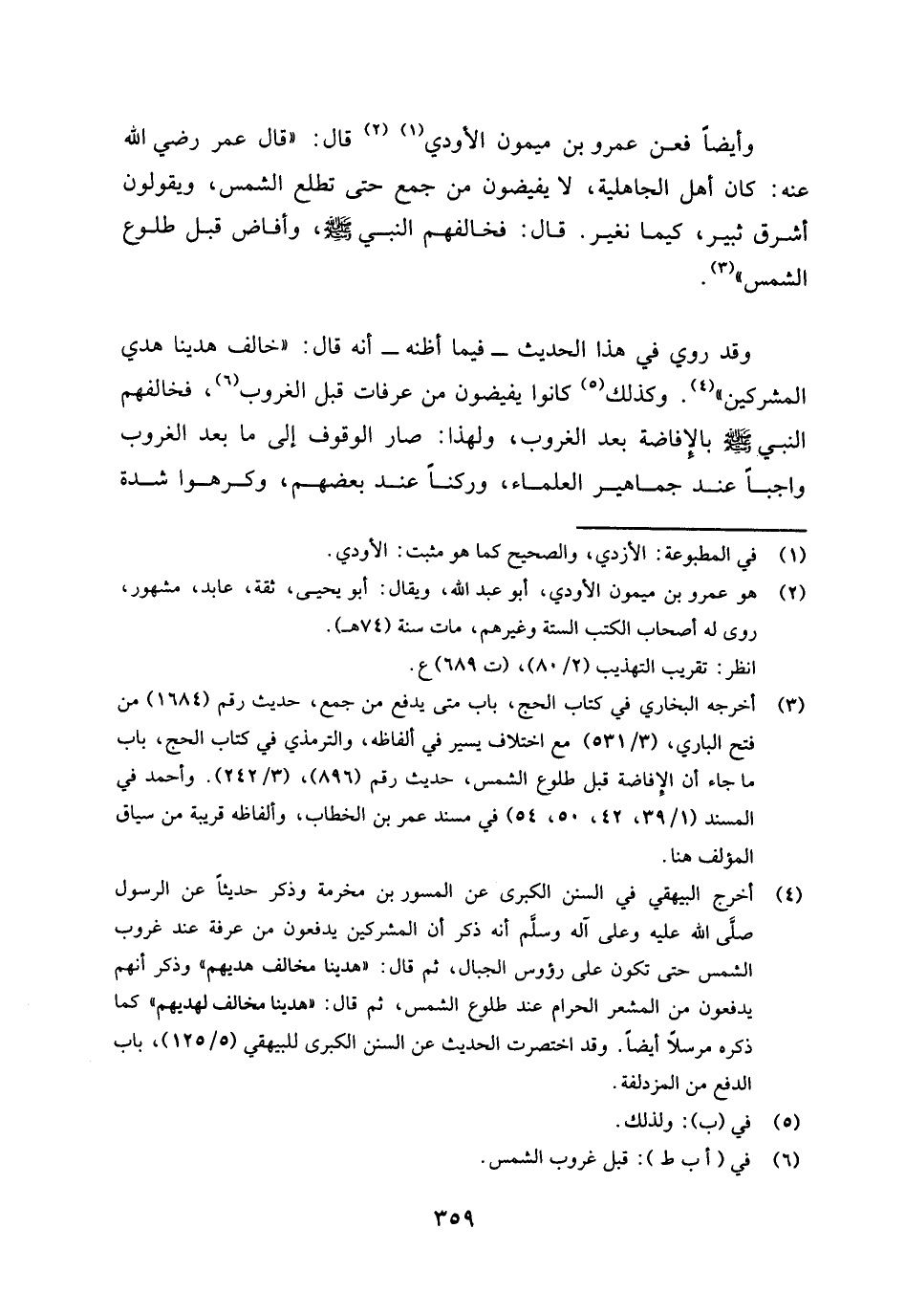 (¬3) أخرج البيهقي في السنن الكبرى عن المسور بن مخرمة، وذكر حديثا عن الرسول صلى الله عليه وعلى آله وسلم أنه ذكر أن المشركين يدفعون من عرفة عند غروب الشمس حتى تكون على رؤوس الجبال، ثم قال: " هدينا مخالف هديهم " وذكر أنهم يدفعون من المشعر الحرام عند طلوع الشمس، ثم قال: " هدينا مخالف لهديم " كما ذكره مرسلا أيضا. وقد اختصرت الحديث عن السنن الكبرى للبيهقي (5 / 125) ، باب الدفع من المزدلفة.