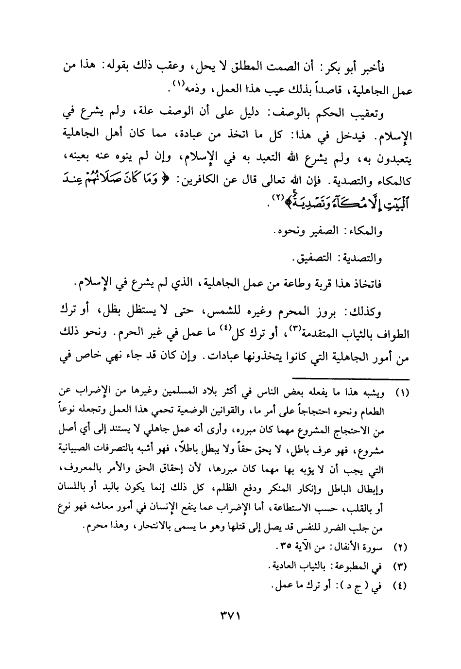 (¬1) ويشبه هذا ما يفعله بعض الناس في أكثر بلاد المسلمين وغيرها من الإضراب عن الطعام ونحوه احتجاجا على أمر ما، والقوانين الوضعية تحمي هذا العمل وتجعله نوعا من الاحتجاج المشروع مهما كان مبرره، وأرى أنه عمل جاهلي لا يستند إلى أي أصل مشروع، فهو عرف باطل، لا يُحق حقا ولا يُبطل باطلا، فهو أشبه بالتصرفات الصبيانية التي يجب أن لا يؤبه بها مهما كان مبررها؛ لأن إحقاق الحق والأمر بالمعروف، وإبطال الباطل وإنكار المنكر ودفع الظلم، كل ذلك إنما يكون باليد أو باللسان أو بالقلب، حسب الاستطاعة، أما الإضراب عما ينفع الإنسان في أمور معاشه فهو نوع من جلب الضرر للنفس قد يصل إلى قتلها وهو ما يسمى بالانتحار، وهذا محرم.