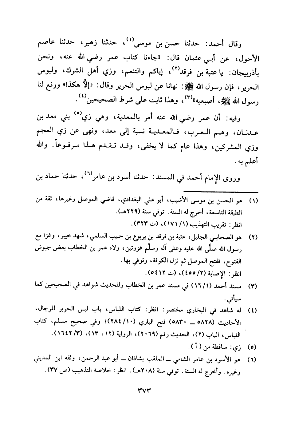 وقال أحمد: حدثنا حسن بن موسى (¬1) حدثنا زهير، حدثنا عاصم الأحول، عن أبي عثمان قال: " جاءنا كتاب عمر رضي الله عنه، ونحن بأذربيجان: يا عتبة بن فرقد (¬2) إياكم والتنعم، وزي أهل الشرك، ولبوس الحرير، فإن رسول الله صلى الله عليه وسلم: «نهانا عن لبوس الحرير وقال: " إلا هكذا " ورفع لنا رسول الله صلى الله عليه وسلم، أصبعيه» (¬3) وهذا ثابت على شرط الصحيحين (¬4) .