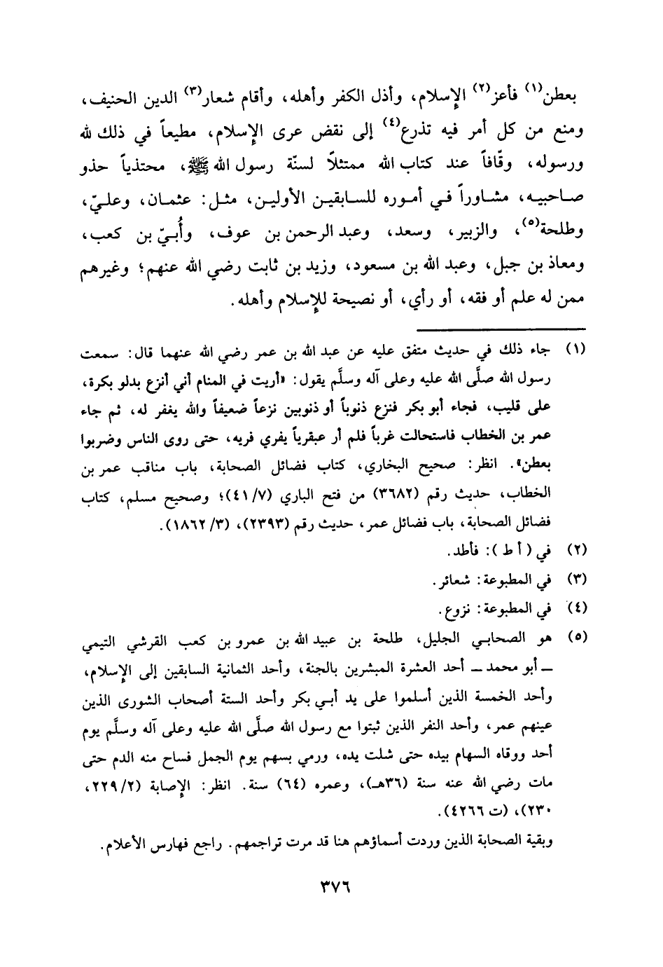 (¬5) هو الصحابي الجليل: طلحة بن عبيد الله بن عمرو بن كعب القرشي التيمي، أبو محمد، أحد العشرة المبشرين بالجنة، وأحد الثمانية السابقين إلى الإسلام، وأحد الخمسة الذين أسلموا على يد أبي بكر وأحد الستة أصحاب الشورى الذين عينهم عمر، وأحد النفر الذين ثبتوا مع رسول الله صلى الله عليه وعلى آله وسلم يوم أحد ووقاه السهام بيده حتى شلت يده، ورمي بسهم يوم الجمل فساح منه الدم حتى مات رضي الله عنه سنة (36 هـ) ، وعمره (64) سنة. انظر: الإصابة (2 / 229، 230) ، (ت 4266) .