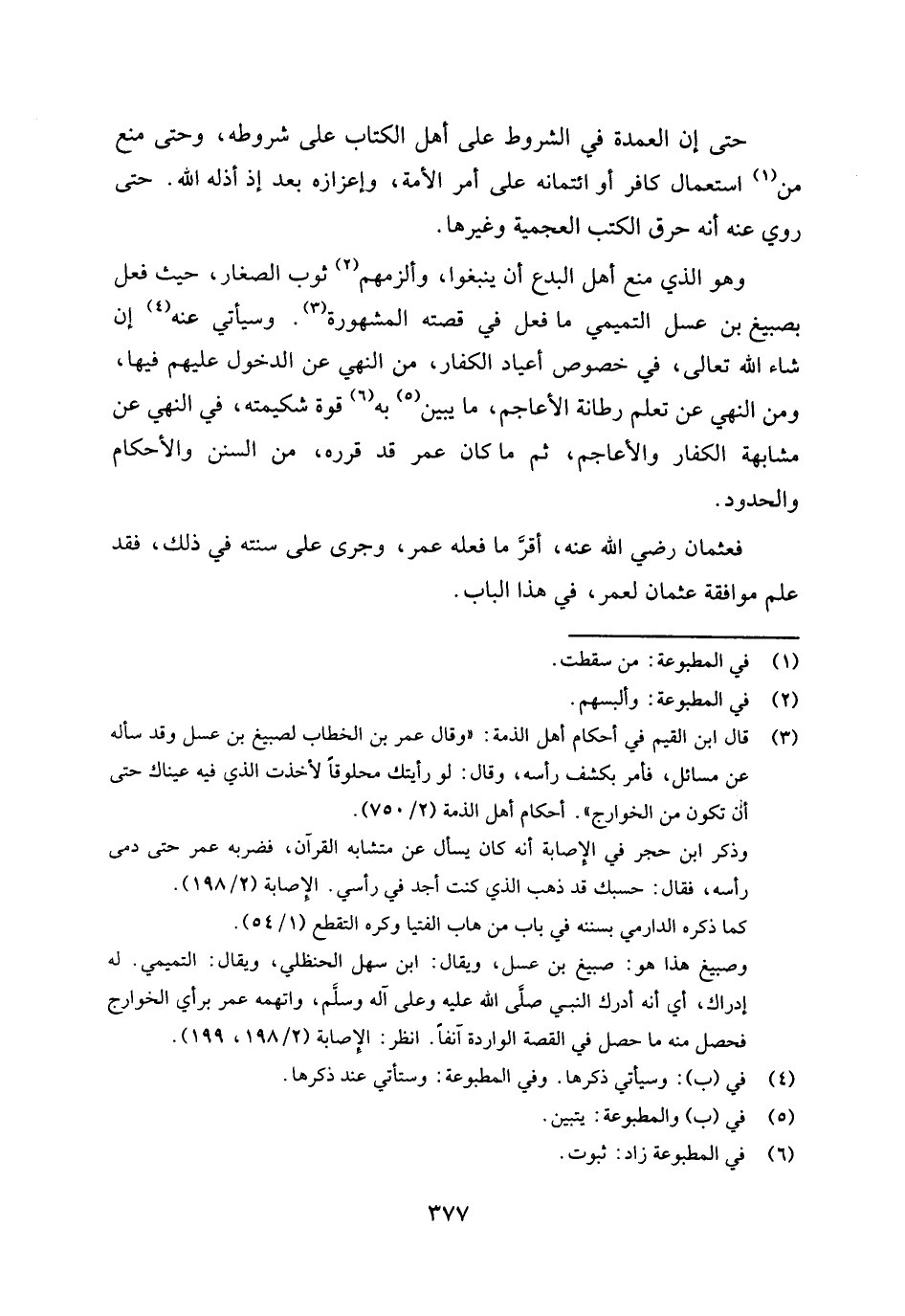 (¬3) قال: ابن القيم في أحكام أهل الذمة: " وقال عمر بن الخطاب لصبيغ بن عسل وقد سأله عن مسائل، فأمر بكشف رأسه، وقال: لو رأيتك محلوق لأخذت الذي فيه عيناك حتى أن تكون من الخوارج ". أحكام أهل الذمة (2 / 750) .