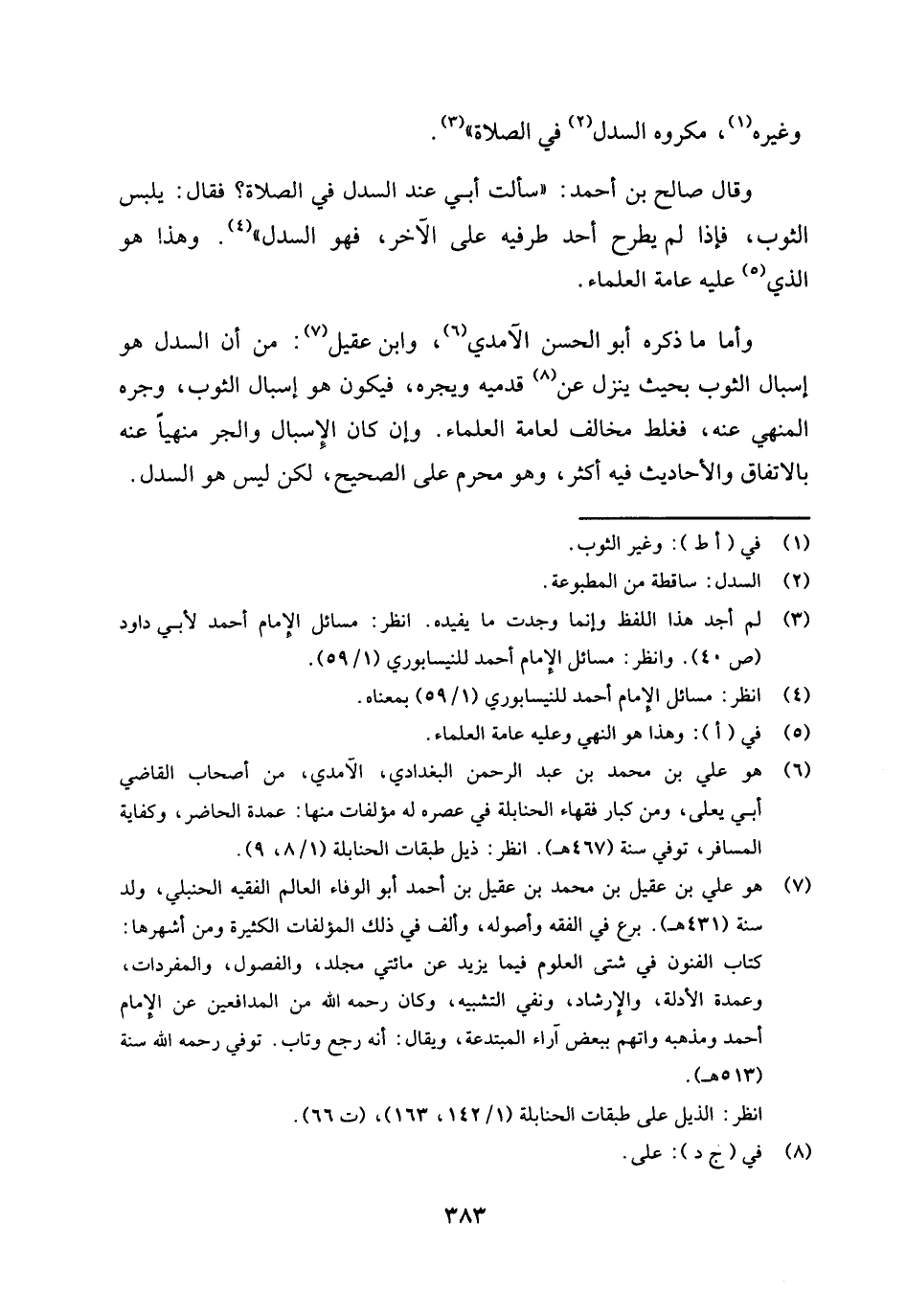 وأما ما ذكره أبو الحسن الآمدي (¬6) وابن عقيل (¬7) من أن السدل هو إسبال الثوب بحيث ينزل عن (¬8) قدميه ويجره، فيكون هو إسبال الثوب، وجره المنهي عنه؛ فغلط مخالف لعامة العلماء وإن كان الإسبال والجر منهيا عنه بالاتفاق والأحاديث فيه أكثر، وهو محرم على الصحيح، لكن ليس هو السدل.