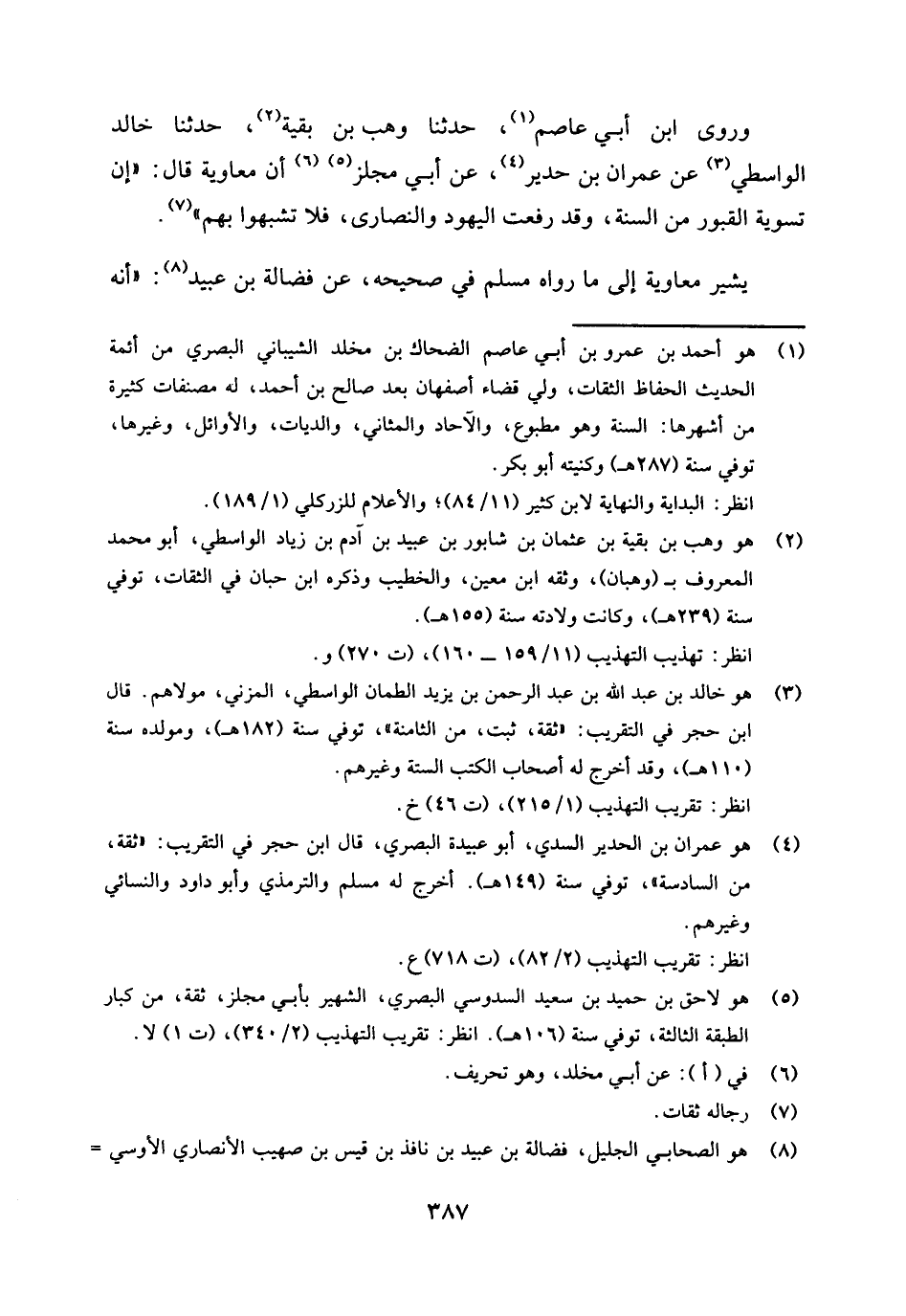 وروى ابن أبي عاصم (¬1) حدثنا وهب بن بقية (¬2) حدثنا خالد الواسطي (¬3) عن عمران بن حدير (¬4) عن أبي مجلز (¬5) أن معاوية قال: " إن تسوية القبور من السنة، وقد رفعت اليهود والنصارى، فلا تشبهوا بهم " (¬6) .