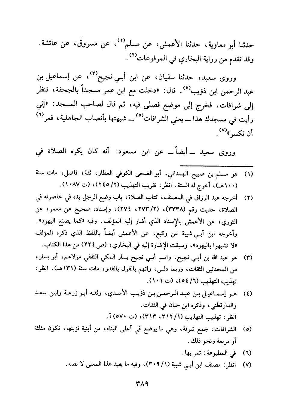 وروى سعيد، حدثنا سفيان، عن ابن أبي نجيح (¬3) عن إسماعيل بن عبد الرحمن بن ذؤيب (¬4) قال: " دخلت مع ابن عمر مسجدا بالجحفة، فنظر إلى شرافات، فخرج إلى موضع فصلى فيه، ثم قال لصاحب المسجد: إني رأيت في مسجدك هذا - يعني الشرافات (¬5) - شبهتها بأنصاب الجاهلية، فمر (¬6) بها أن تكسر " (¬7) .