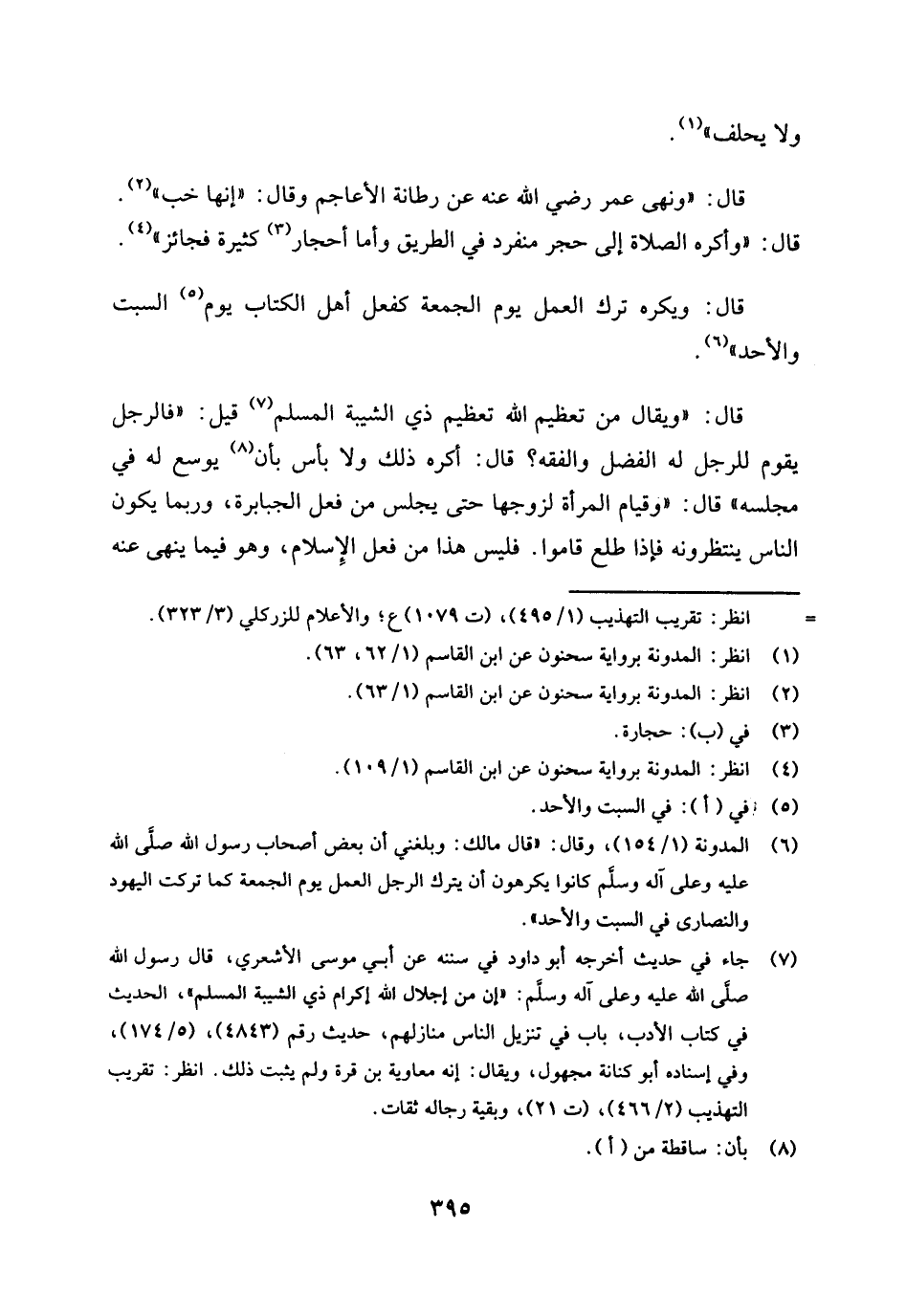 (¬6) المدونة (1 / 154) ، وقال: "قال مالك: وبلغني أن بعض أصحاب رسول الله صلى الله عليه وعلى آله وسلم كانوا يكرهون أن يترك الرجل العمل يوم الجمعة كما تركت اليهود والنصارى في السبت والأحد".
