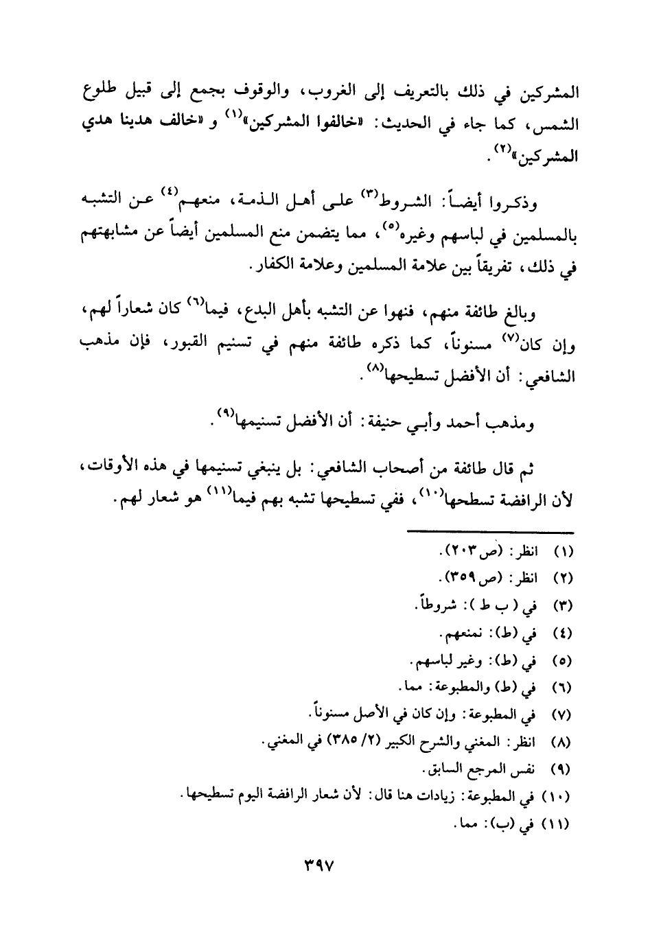 وذكروا أيضا: الشروط (¬3) على أهل الذمة، منعهم (¬4) عن التشبه بالمسلمين في لباسهم وغيره (¬5) مما يتضمن منع المسلمين أيضا من مشابهتهم في ذلك تفريقا بين علامة المسلمين وعلامة الكفار.