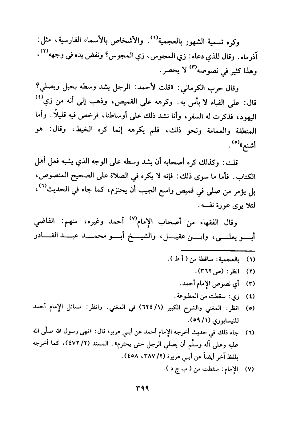 قلت: وكذلك كره أصحابه أن يشد وسطه على الوجه الذي يشبه فعل أهل الكتاب. فأما ما سوى ذلك: فإنه لا يكره في الصلاة على الصحيح المنصوص، بل يؤمر من صلى في قميص واسع الجيب أن يحتزم، كما جاء في الحديث (¬6) ؛ لئلا يرى عورة نفسه.