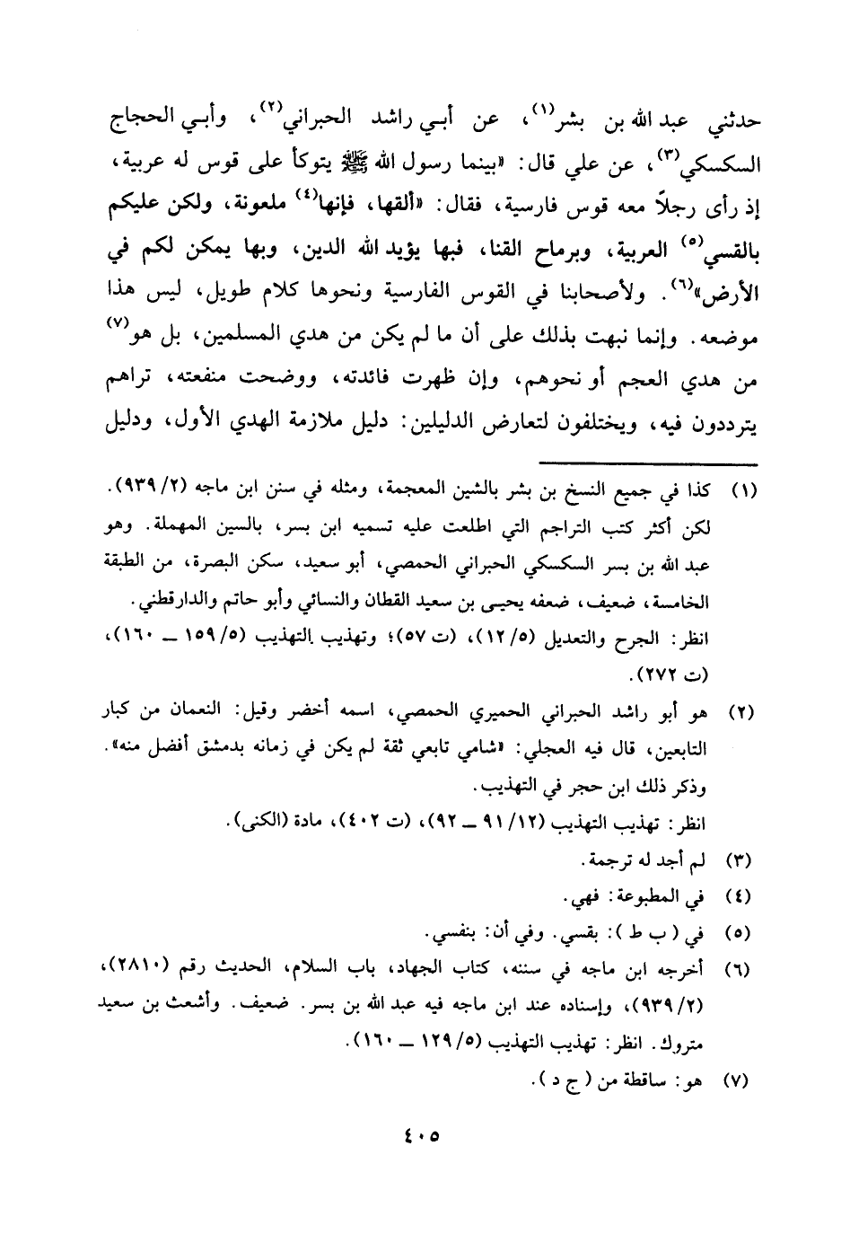 حدثني عبد الله بن بشر (¬1) عن أبي راشد الحبراني (¬2) وأبي الحجاج السكسكي (¬3) عن علي قال: «بينما رسول الله صلى الله عليه وسلم يتوكأ على قوس له عربية، إذ رأى رجلا معه قوس فارسية، فقال: " ألقها، فإنها (¬4) ملعونة، ولكن عليكم بالقسي (¬5) العربية، وبرماح القنا، فبها يؤيد الله الدين، وبها يمكن لكم في الأرض» (¬6) .