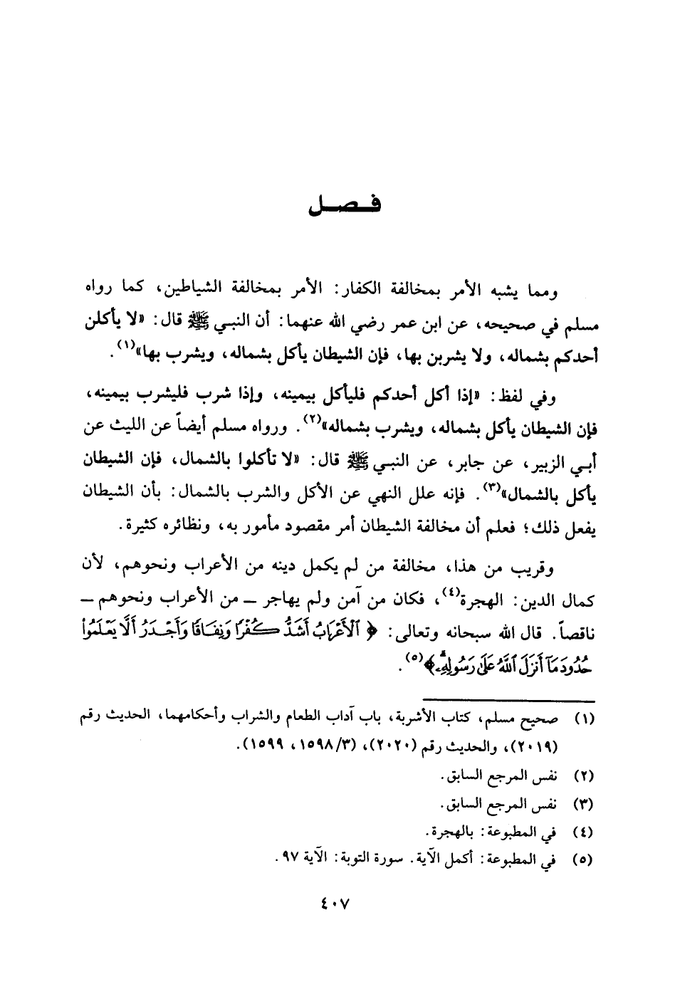 فصل ومما يشبه الأمر بمخالفة الكفار: الأمر بمخالفة الشياطين، كما رواه مسلم في صحيحه، عن ابن عمر رضي الله عنهما: أن النبي صلى الله عليه وسلم قال: «لا يأكلن أحدكم بشماله، ولا يشربن بها، فإن الشيطان يأكل بشماله، ويشرب بها» (¬1) .