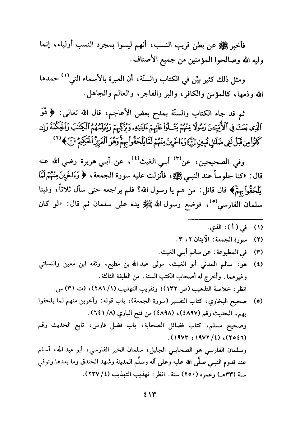 ثم قد جاء الكتاب والسنة بمدح بعض الأعاجم، قال الله تعالى: {هُوَ الَّذِي بَعَثَ فِي الْأُمِّيِّينَ رَسُولًا مِنْهُمْ يَتْلُو عَلَيْهِمْ آيَاتِهِ وَيُزَكِّيهِمْ وَيُعَلِّمُهُمُ الْكِتَابَ وَالْحِكْمَةَ وَإِنْ كَانُوا مِنْ قَبْلُ لَفِي ضَلَالٍ مُبِينٍ - وَآخَرِينَ مِنْهُمْ لَمَّا يَلْحَقُوا بِهِمْ وَهُوَ الْعَزِيزُ الْحَكِيمُ} [الجمعة: 2 - 3] (¬2) .