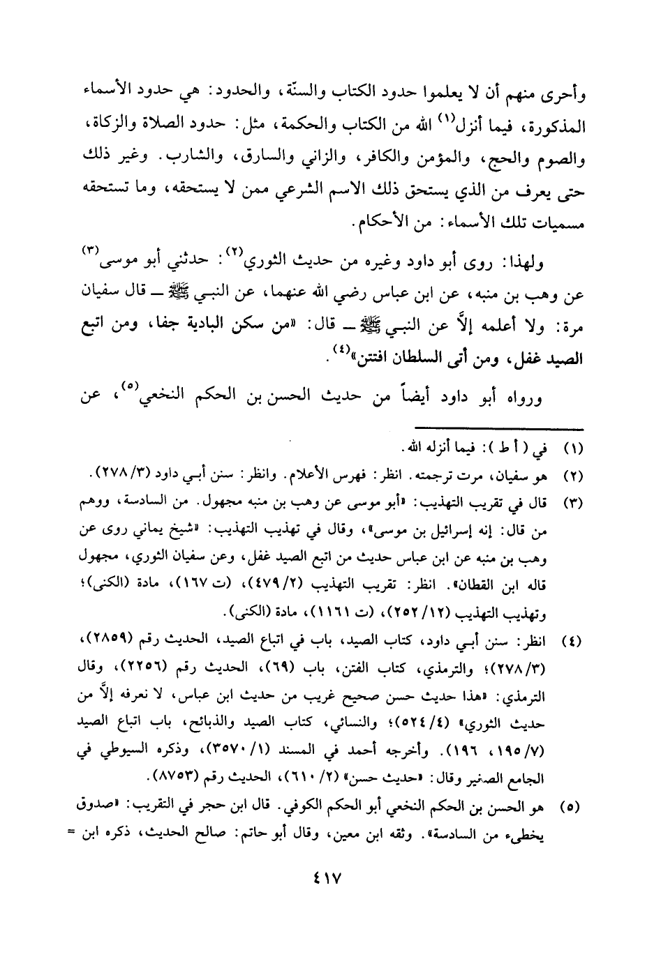 (¬4) انظر: سنن أبي داود، كتاب الصيد، باب في اتباع الصيد، الحديث رقم (2859) ، (3 / 278) ؛ والترمذي، كتاب الفتن، باب (69) ، الحديث رقم (2256) ، وقال الترمذي: "هذا حديث حسن صحيح غريب من حديث ابن عباس، لا نعرفه إلا من حديث الثوري" (4 / 524) ؛ والنسائي، كتاب الصيد والذبائح، باب اتباع الصيد (7 / 195، 196) . وأخرجه أحمد في المسند (1 / 3570) ، وذكره السيوطي في الجامع الصغير وقال: "حديث حسن" (2 / 610) ، الحديث رقم (8753) .
