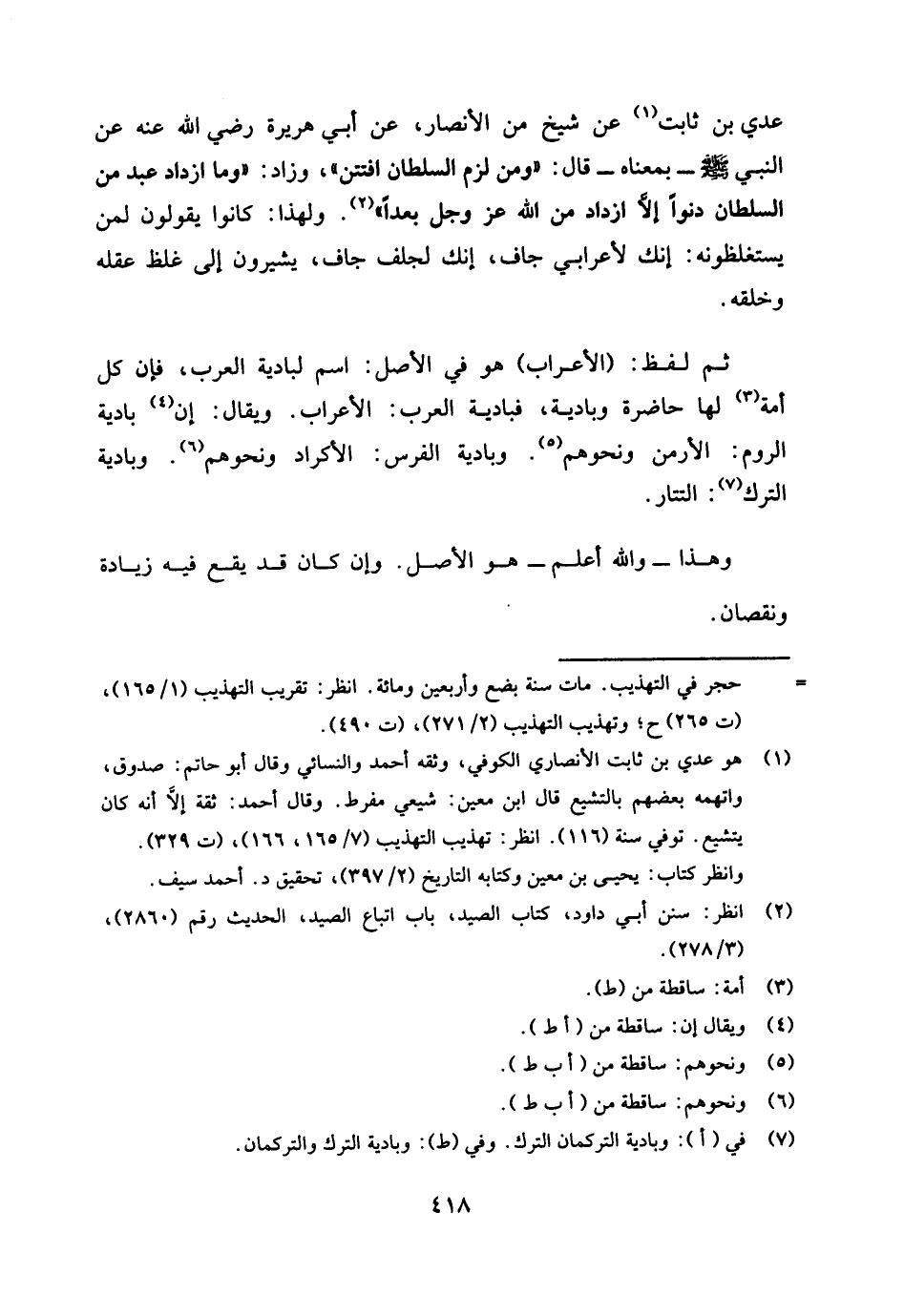 عدي بن ثابت (¬1) عن شيخ من الأنصار، عن أبي هريرة رضي الله عنه، عن النبي صلى الله عليه وسلم - بمعناه - وقال «ومن لزم السلطان افتتن» ، وزاد «وما ازداد عبد من السلطان دنوا إلا ازداد من الله عز وجل بعدا» (¬2) ولهذا: كانوا يقولون لمن يستغلظونه: إنك لأعرابي جاف، إنك لجلف جاف، يشيرون إلى غلظ عقله وخلقه.