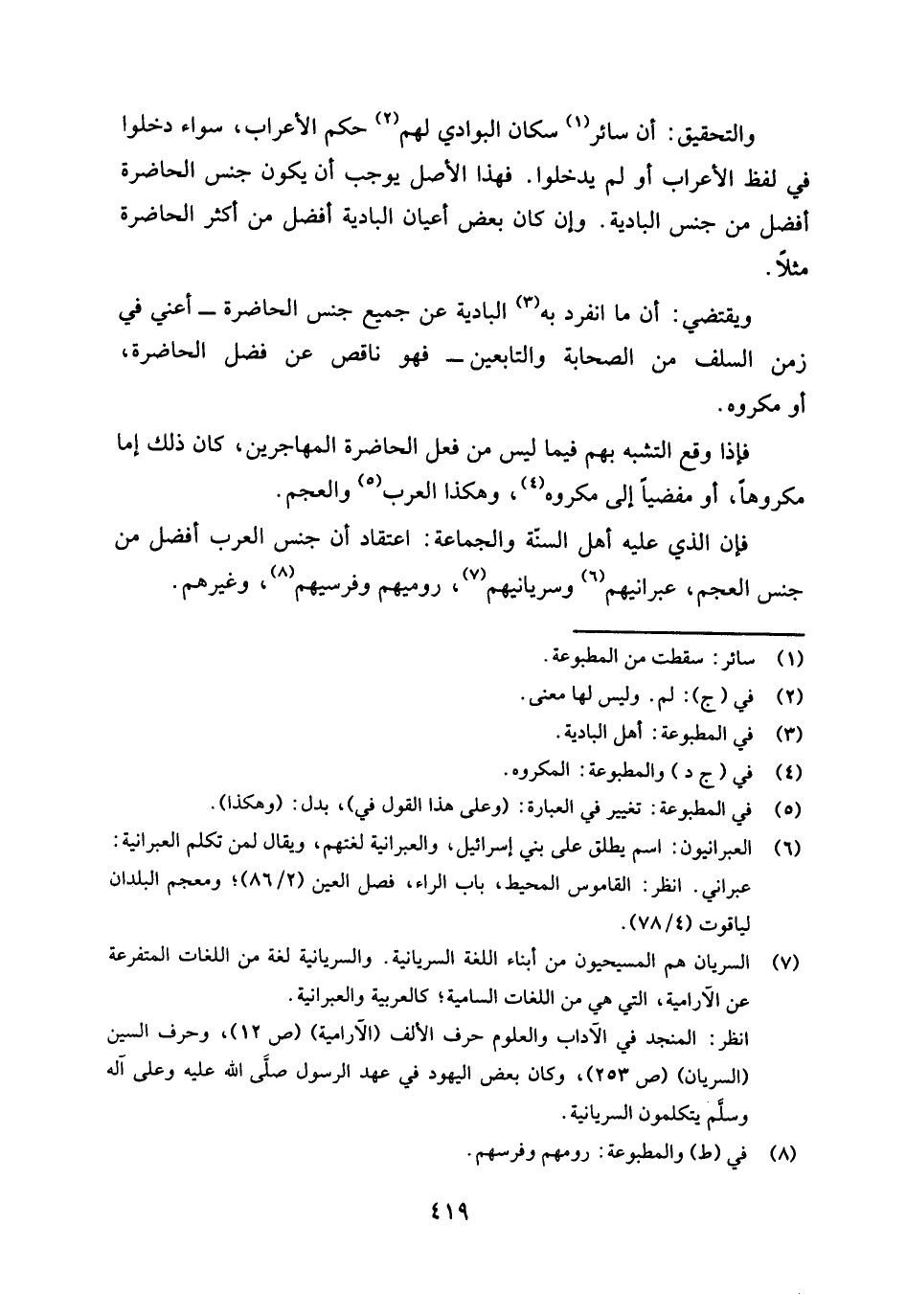 والتحقيق: أن سائر (¬1) سكان البوادي لهم (¬2) حكم الأعراب، سواء دخلوا في لفظ الأعراب أو لم يدخلوا، فهذا الأصل يوجب أن يكون جنس الحاضرة أفضل من جنس البادية، وإن كان بعض أعيان البادية أفضل من أكثر الحاضرة، مثلا.