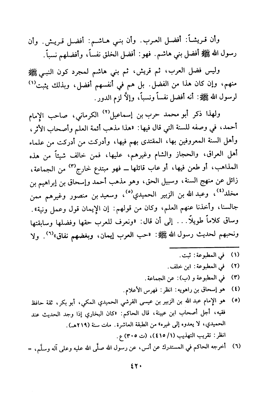 ولهذا ذكر أبو محمد حرب بن إسماعيل (¬2) الكرماني، صاحب الإمام أحمد، في وصفه للسنة التي قال فيها: " هذا مذهب أئمة العلم وأصحاب الأثر، وأهل السنة المعروفين بها، المقتدى بهم فيها، وأدركت من أدركت من علماء أهل العراق، والحجاز والشام وغيرهم عليها، فمن خالف شيئا من هذه المذاهب، أو طعن فيها، أو عاب قائلها - فهو مبتدع خارج (¬3) من الجماعة، زائل عن منهج السنة، وسبيل الحق، وهو مذهب أحمد، وإسحاق بن إبراهيم بن مخلد (¬4) وعبد الله بن الزبير الحميدي (¬5) وسعيد بن منصور، وغيرهم ممن جالسنا، وأخذنا عنهم العلم، وكان من قولهم أن الإيمان قول وعمل ونية "، وساق كلاما طويلا. . . . إلى أن قال: " ونعرف للعرب حقها وفضلها وسابقتها ونحبهم؛ لحديث رسول الله صلى الله عليه وسلم «حب العرب إيمان وبغضهم نفاق» (¬6) ولا