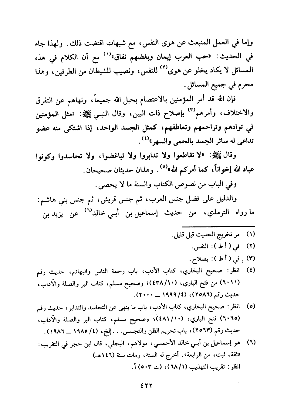 وإما في العمل المنبعث عن هوى النفس، مع شبهات اقتضت ذلك، ولهذا جاء في الحديث: «حب العرب إيمان وبغضهم نفاق» (¬1) مع أن الكلام في هذه المسائل لا يكاد يخلو عن هوى (¬2) للنفس، ونصيب للشيطان من الطرفين، وهذا محرم في جميع المسائل.