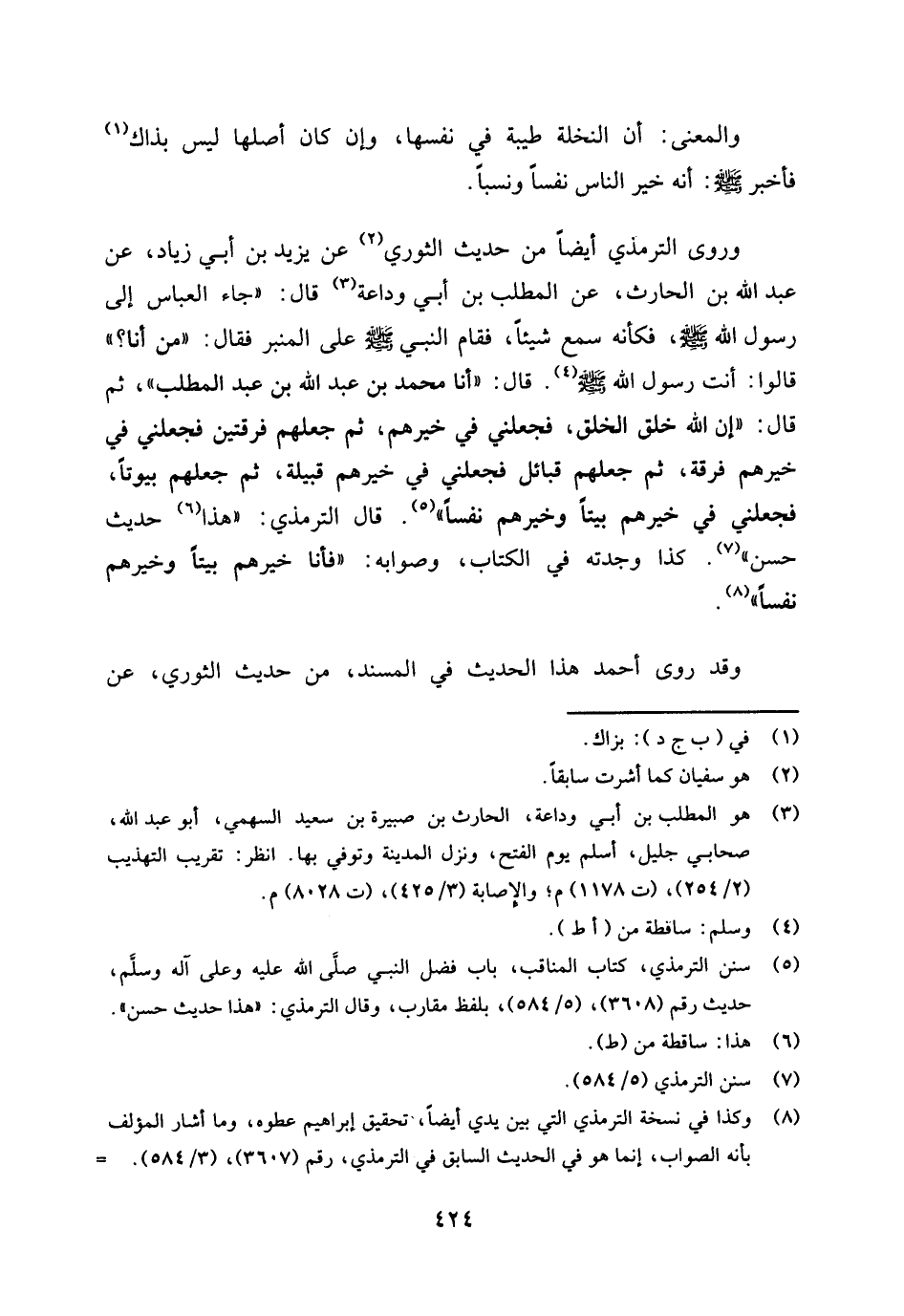 وروى الترمذي أيضا من حديث الثوري (¬2) عن يزيد بن أبي زياد، عن عبد الله بن الحارث، عن المطلب بن أبي وداعة (¬3) قال: «جاء العباس إلى رسول الله صلى الله عليه وسلم، فكأنه سمع شيئا، فقام النبي صلى الله عليه وسلم على المنبر فقال: " من أنا؟ " قالوا: أنت رسول الله صلى الله عليه وسلم (¬4) . قال: " أنا محمد بن عبد الله بن عبد المطلب "، ثم قال: " إن الله خلق الخلق، فجعلني في خيرهم، ثم جعلهم فرقتين فجعلني في خيرهم فرقة، ثم جعلهم قبائل فجعلني في خيرهم قبيلة، ثم جعلهم بيوتا، فجعلني في خيرهم بيتا وخيرهم نفسا» (¬5) قال الترمذي: " هذا (¬6) حديث حسن " (¬7) كذا وجدته في الكتاب، وصوابه: «فأنا خيرهم بيتا وخيرهم نفسا» (¬8) .