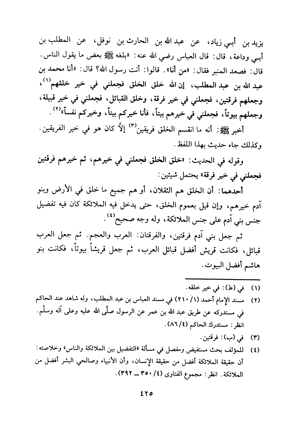 (¬4) للمؤلف بحث مستفيض ومفصل في مسألة "التفضيل بين الملائكة والناس" وخلاصته: أن حقيقة الملائكة أفضل من حقيقة الإنسان، وأن الأنبياء وصالحي البشر أفضل من الملائكة. انظر: مجموع الفتاوى (4 / 350- 392) .