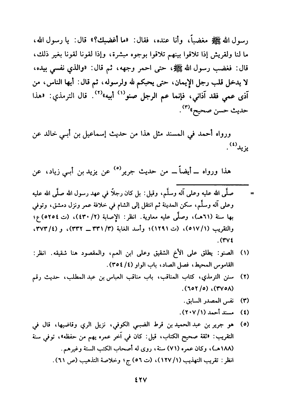 رسول الله صلى الله عليه وسلم مغضبا، وأنا عنده، فقال: " ما أغضبك؟ " قال: يا رسول الله، ما لنا ولقريش: إذا تلاقوا بينهم تلاقوا بوجوه مبشرة، وإذا لقونا لقونا بغير ذلك، قال: فغضب رسول الله صلى الله عليه وسلم حتى احمر وجهه، ثم قال: " والذي نفسي بيده، لا يدخل قلب رجل الإيمان، حتى يحبكم لله ولرسوله - ثم قال -: أيها الناس، من آذى عمي فقد آذاني، فإنما عم الرجل صنو (¬1) أبيه» (¬2) قال الترمذي: " هذا حديث حسن صحيح " (¬3) .