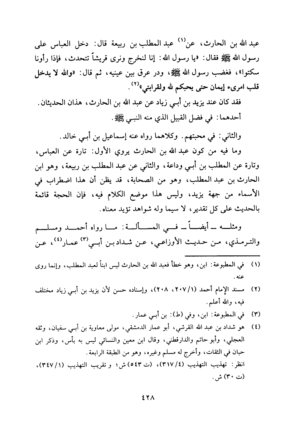وما فيه من كون عبد الله بن الحارث يروي الأول: تارة عن العباس، وتارة عن المطلب بن أبي وداعة، والثاني عن عبد المطلب بن ربيعة، وهو ابن الحارث بن عبد المطلب، وهو من الصحابة، قد يظن أن هذا اضطراب في الأسماء من جهة يزيد، وليس هذا موضع الكلام فيه، فإن الحجة قائمة بالحديث على كل تقدير، لا سيما وله شواهد تؤيد معناه.