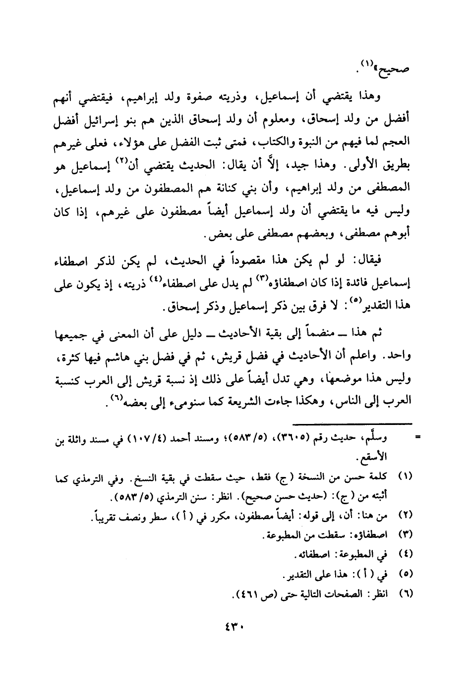 وهذا يقتضي أن إسماعيل وذريته صفوة ولد إبراهيم، فيقتضي أنهم أفضل من ولد إسحاق، ومعلوم أن ولد إسحاق الذين هم بنو إسرائيل أفضل العجم؛ لما فيهم من النبوة والكتاب، فمتى ثبت الفضل على هؤلاء، فعلى غيرهم بطريق الأولى، وهذا جيد، إلا أن يقال: الحديث يقتضي: أن (¬2) إسماعيل هو المصطفى من ولد إبراهيم، وأن بني كنانة هم المصطفون من ولد إسماعيل، وليس فيه ما يقتضي أن ولد إسماعيل أيضا مصطفون على غيرهم، إذا كان أبوهم مصطفى، وبعضهم مصطفى على بعض.