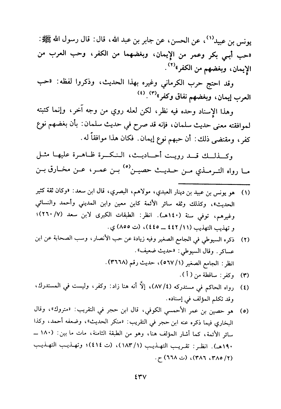 يونس بن عبيد (¬1) عن الحسن، عن جابر بن عبد الله، قال: قال رسول الله صلى الله عليه وسلم: «حب أبي بكر وعمر من الإيمان، وبغضهما من الكفر، وحب العرب من الإيمان، وبغضهم من الكفر» (¬2) .