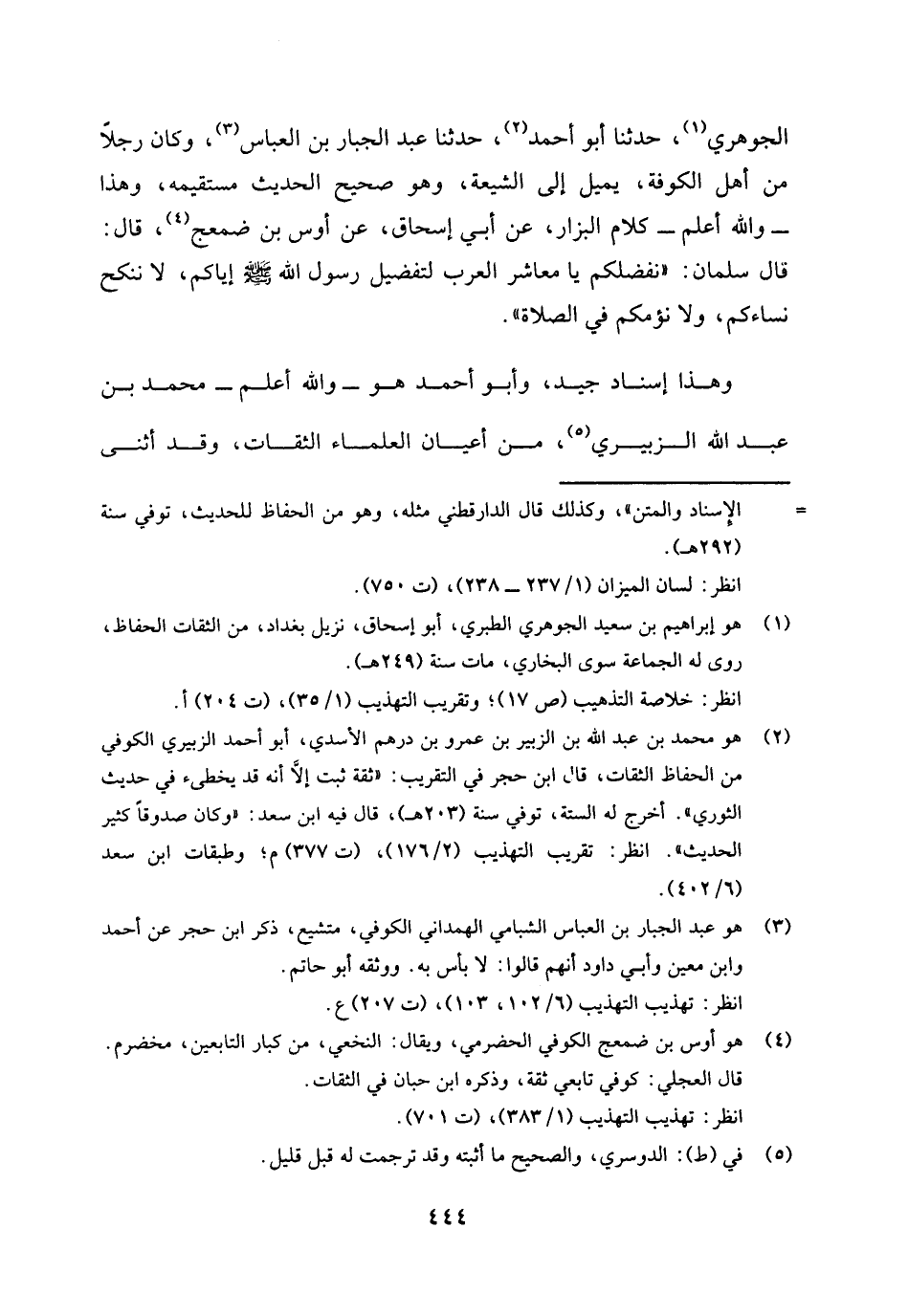 الجوهري (¬1) حدثنا أبو أحمد (¬2) حدثنا عبد الجبار بن العباس (¬3) وكان رجلا من أهل الكوفة، يميل إلى الشيعة، وهو صحيح الحديث مستقيمه، وهذا - والله أعلم - كلام البزار، عن أبي إسحاق، عن أوس بن ضمعج (¬4) قال: قال سلمان: " نفضلكم يا معاشر العرب لتفضيل رسول الله صلى الله عليه وسلم إياكم، لا ننكح نساءكم، ولا نؤمكم في الصلاة ".