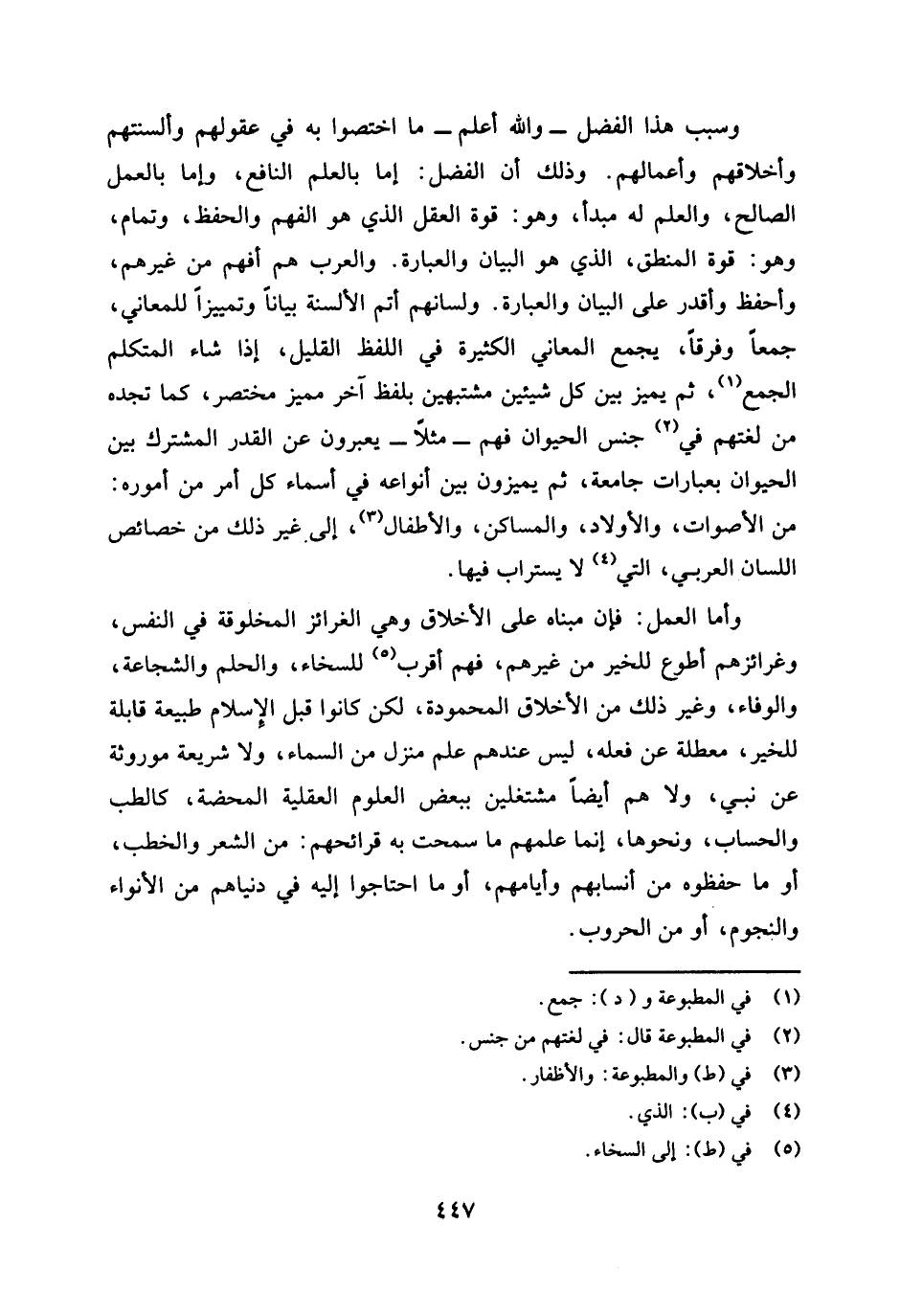 وأما العمل: فإن مبناه على الأخلاق وهي الغرائز المخلوقة في النفس، وغرائزهم أطوع للخير من غيرهم، فهم أقرب للسخاء، والحلم، والشجاعة، والوفاء، وغير ذلك من الأخلاق المحمودة، لكن كانوا قبل الإسلام طبيعة قابلة للخير، معطلة عن فعله، ليس عندهم علم منزل من السماء، ولا شريعة موروثة عن نبي، ولا هم أيضا مشتغلين ببعض العلوم العقلية المحضة، كالطب والحساب، ونحوها، إنما علمهم ما سمحت به قرائحهم: من الشعر والخطب، وما حفظوه من أنسابهم وأيامهم، وما احتاجوا إليه في دنياهم من الأنواء والنجوم، أو من الحروب.