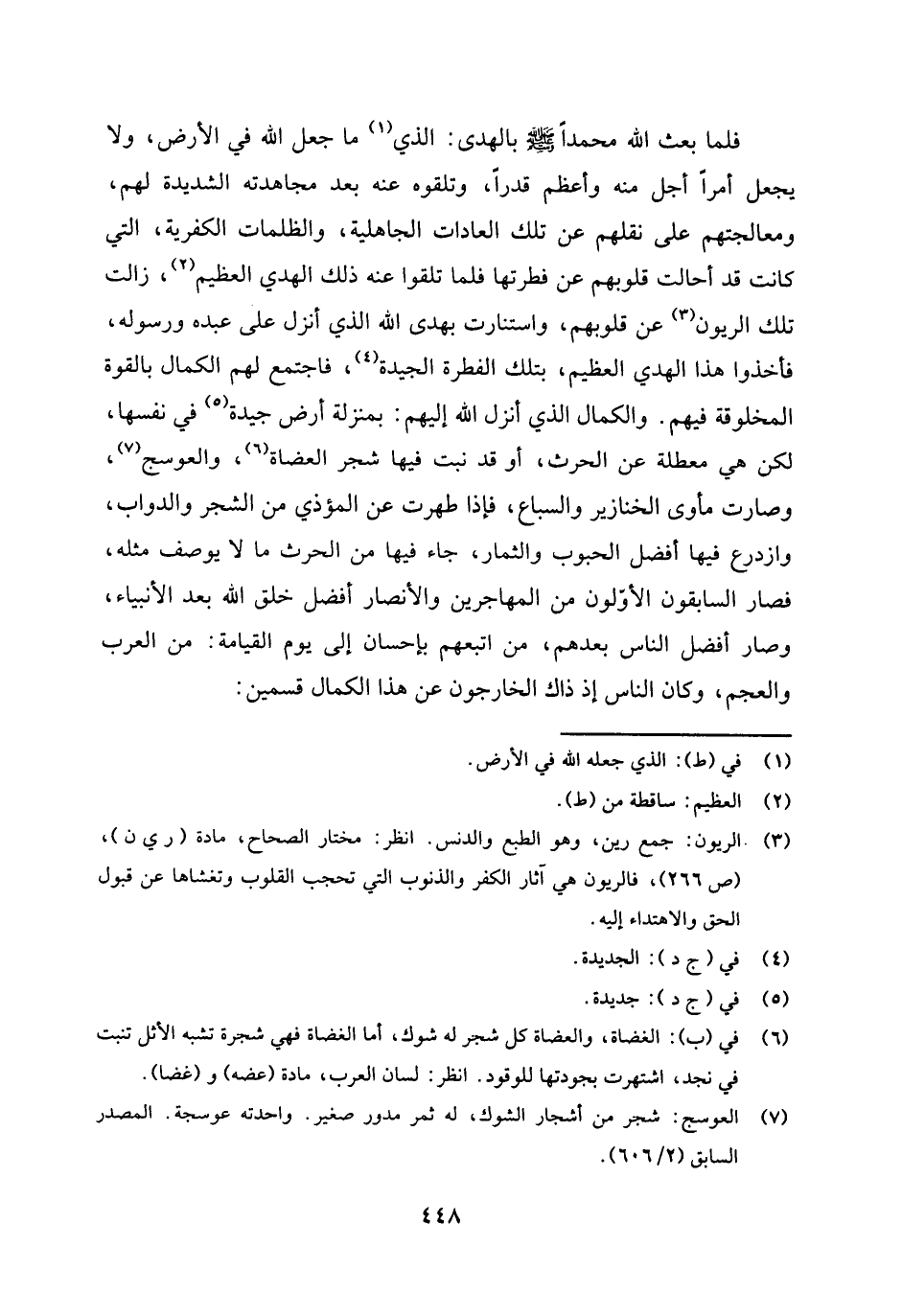 فأخذوا هذا الهدى العظيم، بتلك الفطرة الجيدة (¬4) فاجتمع لهم الكمال بالقوة المخلوقة فيهم، والكمال الذي أنزل الله إليهم: بمنزلة أرض جيدة (¬5) في نفسها، لكن هي معطلة عن الحرث، أو قد نبت فيها شجر العضاة (¬6) والعوسج (¬7) وصارت مأوى الخنازير والسباع، فإذا طهرت عن المؤذي من الشجر والدواب، وازدرع فيها أفضل الحبوب والثمار، جاء فيها من الحرث ما لا يوصف مثله، فصار السابقون الأولون من المهاجرين والأنصار أفضل خلق الله بعد الأنبياء، وصار أفضل الناس بعدهم: من اتبعهم بإحسان إلى يوم القيامة: من العرب والعجم.