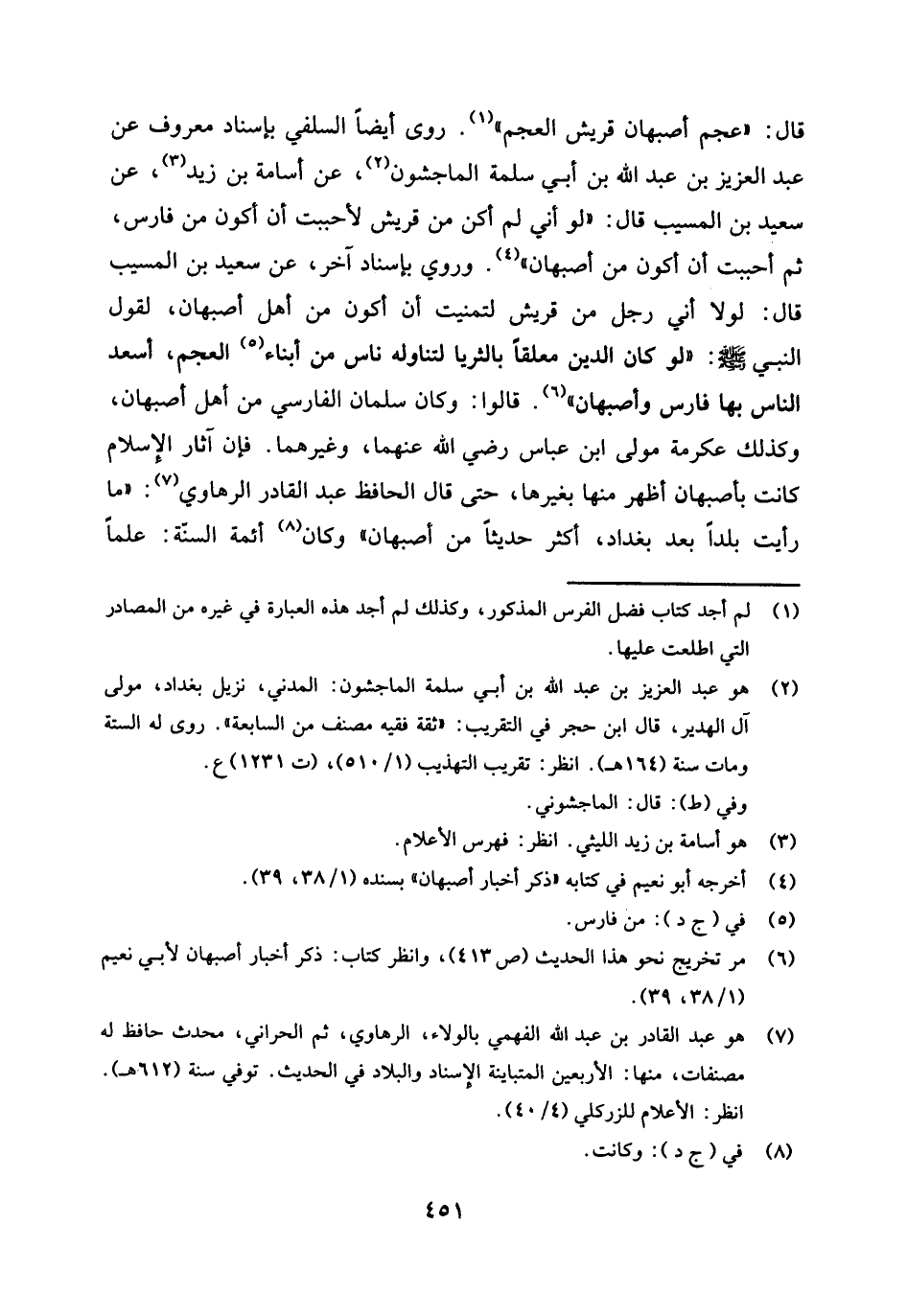 وروى أيضا السلفي بإسناد معروف عن عبد العزيز بن عبد الله بن أبي سلمة الماجشون (¬2) عن أسامة بن زيد (¬3) عن سعيد بن المسيب قال: " لو أني لم أكن من قريش لأحببت أن أكون من فارس، ثم أحببت أن أكون من أصبهان " (¬4) .