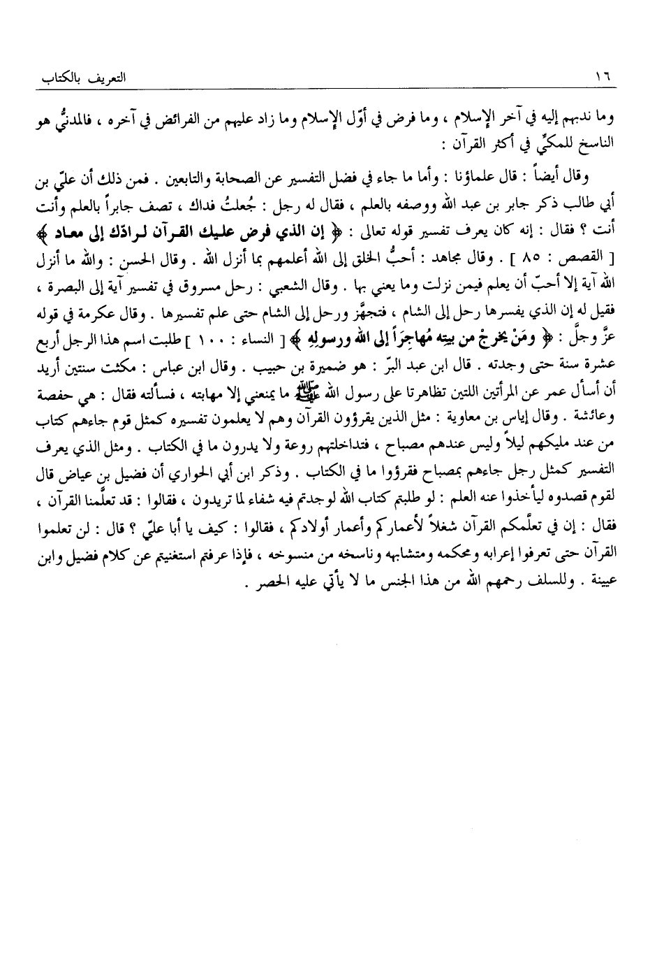 وقال أيضا: قال علماؤنا: وأما ما جاء في فضل التفسير عن الصحابة والتابعين. فمن ذلك أن عليّ بن أبي طالب ذكر جابر بن عبد الله ووصفه بالعلم، فقال له رجل: جعلت فداك، تصف جابرا بالعلم وأنت أنت؟ فقال: إنه كان يعرف تفسير قَوْلَهُ تَعَالَى: إِنَّ الَّذِي فَرَضَ عَلَيْكَ الْقُرْآنَ لَرادُّكَ إِلى مَعادٍ [القصص: 85] . وقال مجاهد: أحبّ الخلق إلى الله أعلمهم بما أنزل الله. وقال الحسن: والله ما أنزل الله آية إلا أحبّ أن يعلم فيمن نزلت وما يعني بها. وقال الشعبي: رحل مسروق في تفسير آية إلى البصرة، فقيل له إن الذي يفسرها رحل إلى الشام، فتجهّز ورحل إلى الشام حتى علم تفسيرها. وقال عكرمة في قوله عزّ وجلّ: وَمَنْ يَخْرُجْ مِنْ بَيْتِهِ مُهاجِراً إِلَى اللَّهِ وَرَسُولِهِ [النساء: 100] طلبت اسم هذا الرجل أربع عشرة سنة حتى وجدته. قال ابن عبد البرّ: هو ضميرة بن حبيب. وقال ابن عباس: مكثت سنتين أريد أن أسأل عمر عَنِ الْمَرْأَتَيْنِ اللَّتَيْنِ تَظَاهَرَتَا عَلَى رَسُولِ اللَّهِ صَلَّى اللَّهُ عَلَيْهِ وَسَلَّمَ مَا يمنعني إلا مهابته، فسألته فقال: هي حفصة وعائشة. وقال إياس بن معاوية: مثل الذين يقرءون القرآن وهم لا يعلمون تفسيره كمثل قوم جاءهم كتاب من عند مليكهم ليلا وليس عندهم مصباح، فتداخلتهم روعة ولا يدرون ما في الكتاب. ومثل الذي يعرف التفسير كمثل رجل جاءهم بمصباح فقرؤوا ما في الكتاب. وذكر ابن أبي الحواري أن فضيل بن عياض قال لقوم قصدوه ليأخذوا عنه العلم: لو طلبتم كتاب الله لوجدتم فيه شفاء لما تريدون، فقالوا: قد تعلّمنا القرآن، فقال: إن في تعلّمكم القرآن شغلا لأعماركم وأعمار أولادكم، فقالوا: كيف يا أبا عليّ؟ قال: لن تعلموا القرآن حتى تعرفوا إعرابه ومحكمه ومتشابهه وناسخه من منسوخه، فإذا عرفتم استغنيتم عن كلام فضيل وابن عيينة. وللسلف رحمهم الله من هذا الجنس ما لا يأتي عليه الحصر.