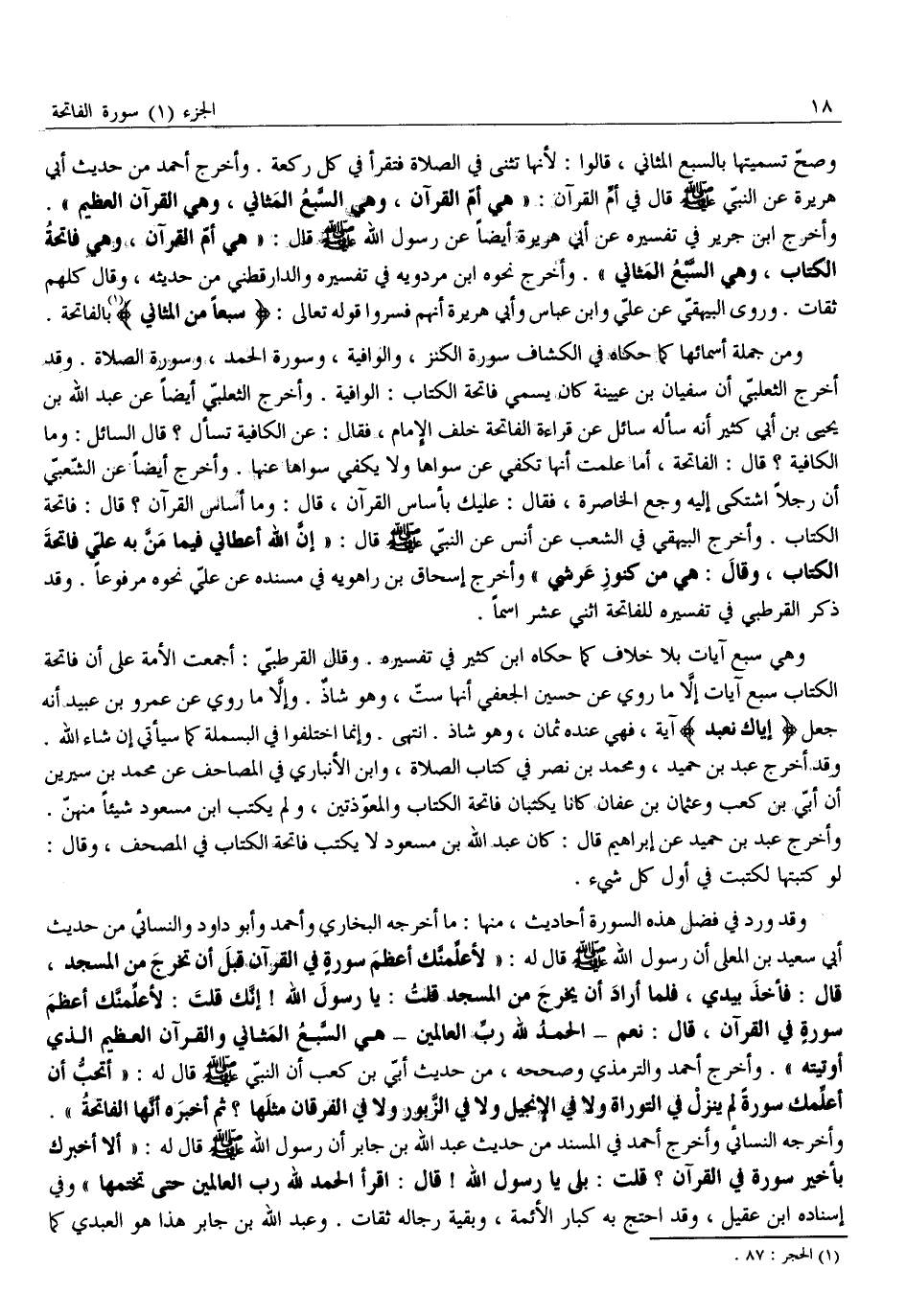 وَأَخْرَجَ ابْنُ جَرِيرٍ فِي تَفْسِيرِهِ عَنْ أبي هريرة أيضا عَنْ رَسُولِ اللَّهِ صَلَّى اللَّهُ عَلَيْهِ وَسَلَّمَ قَالَ: «هِيَ أُمُّ الْقُرْآنِ، وَهِيَ فَاتِحَةُ الْكِتَابِ، وَهِيَ السَّبْعُ الْمَثَانِي» . وَأَخْرَجَ نَحْوَهُ ابْنُ مَرْدَوَيْهِ فِي تَفْسِيرِهِ وَالدَّارَقُطْنِيُّ مِنْ حَدِيثِهِ، وَقَالَ كُلُّهُمْ ثِقَاتٌ. وَرَوَى الْبَيْهَقِيُّ عَنْ عَلِيٍّ وَابْنِ عَبَّاسٍ وَأَبِي هُرَيْرَةَ أَنَّهُمْ فَسَّرُوا قَوْلَهُ تَعَالَى: سَبْعاً مِنَ الْمَثانِي «1» بِالْفَاتِحَةِ.