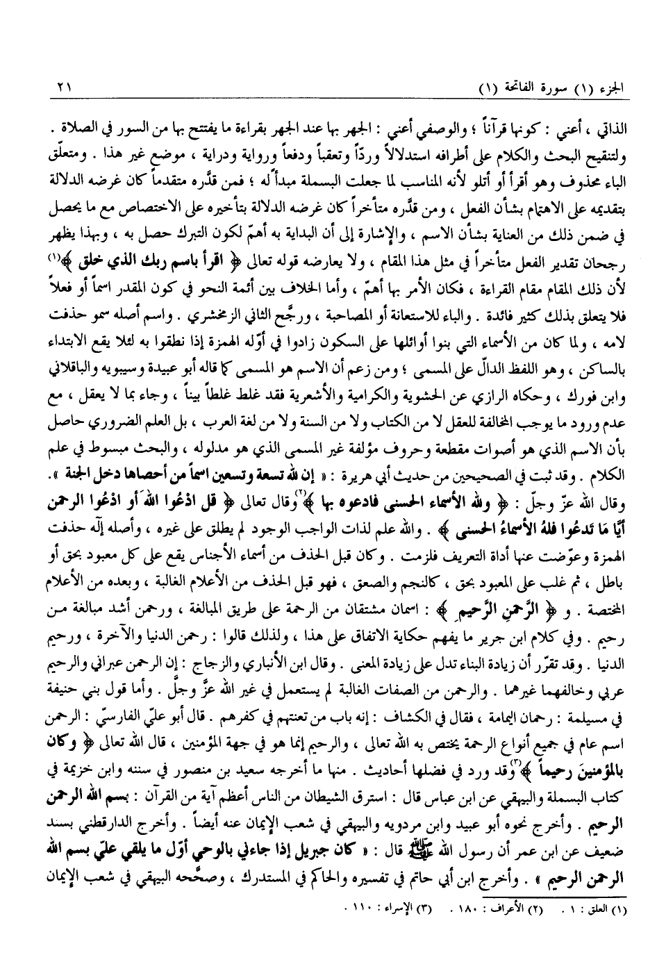 وَلِتَنْقِيحِ الْبَحْثِ وَالْكَلَامِ عَلَى أَطْرَافِهِ اسْتِدْلَالًا وَرَدًّا وَتَعَقُّبًا وَدَفْعًا وَرِوَايَةً وَدِرَايَةً، مَوْضِعٌ غَيْرُ هَذَا. وَمُتَعَلِّقُ الْبَاءِ مَحْذُوفٌ وَهُوَ أَقْرَأُ أَوْ أَتْلُو لِأَنَّهُ الْمُنَاسِبُ لِمَا جُعِلَتِ الْبَسْمَلَةُ مَبْدَأً لَهُ فَمَنْ قَدَّرَهُ مُتَقَدِّمًا كَانَ غَرَضُهُ الدَّلَالَةَ بِتَقْدِيمِهِ عَلَى الِاهْتِمَامِ بِشَأْنِ الْفِعْلِ، وَمَنْ قَدَّرَهُ مُتَأَخِّرًا كَانَ غَرَضُهُ الدَّلَالَةَ بِتَأْخِيرِهِ عَلَى الِاخْتِصَاصِ مَعَ مَا يَحْصُلُ فِي ضِمْنِ ذَلِكَ مِنَ الْعِنَايَةِ بِشَأْنِ الِاسْمِ، وَالْإِشَارَةِ إِلَى أَنَّ الْبِدَايَةَ بِهِ أَهَمُّ لِكَوْنِ التَّبَرُّكِ حَصَلَ بِهِ، وَبِهَذَا يَظْهَرُ رُجْحَانُ تَقْدِيرِ الْفِعْلِ مُتَأَخِّرًا فِي مِثْلِ هَذَا الْمَقَامِ، وَلَا يُعَارِضُهُ قَوْلُهُ تَعَالَى اقْرَأْ بِاسْمِ رَبِّكَ الَّذِي خَلَقَ «1» لِأَنَّ ذَلِكَ الْمَقَامَ مَقَامُ الْقِرَاءَةِ، فَكَانَ الْأَمْرُ بِهَا أَهَمَّ، وَأَمَّا الْخِلَافُ بَيْنَ أَئِمَّةِ النَّحْوِ فِي كَوْنِ الْمُقَدَّرِ اسْمًا أَوْ فِعْلًا فَلَا يَتَعَلَّقُ بِذَلِكَ كَثِيرُ فَائِدَةٍ. وَالْبَاءُ لِلِاسْتِعَانَةِ أَوْ المصاحبة، وَرَجَّحَ الثَّانِي الزَّمَخْشَرِيُّ. وَاسْمٌ أَصْلُهُ سَمَوٌ حُذِفَتْ لَامُهُ، وَلَمَّا كَانَ مِنَ الْأَسْمَاءِ الَّتِي بَنَوْا أَوَائِلَهَا عَلَى السُّكُونِ زَادُوا فِي أَوَّلِهِ الْهَمْزَةَ إِذَا نَطَقُوا بِهِ لِئَلَّا يَقَعَ الِابْتِدَاءُ بِالسَّاكِنِ، وَهُوَ اللَّفْظُ الدَّالُّ عَلَى الْمُسَمَّى وَمَنْ زَعَمَ أَنَّ الِاسْمَ هُوَ الْمُسَمَّى كَمَا قَالَهُ أَبُو عُبَيْدَةَ وَسِيبَوَيْهِ وَالْبَاقِلَّانِيُّ وَابْنُ فُورَكٍ، وَحَكَاهُ الرَّازِيُّ عَنِ الْحَشْوِيَّةِ وَالْكَرَّامِيَّةِ وَالْأَشْعَرِيَّةِ فَقَدْ غَلِطَ غَلَطًا بَيِّنًا، وَجَاءَ بِمَا لَا يُعْقَلُ، مَعَ عَدَمِ وُرُودِ مَا يُوجِبُ الْمُخَالَفَةَ لِلْعَقْلِ لَا مِنَ الْكِتَابِ وَلَا مِنَ السُّنَّةِ وَلَا مِنْ لُغَةِ الْعَرَبِ، بَلِ الْعِلْمُ الضَّرُورِيُّ حَاصِلٌ بِأَنَّ الِاسْمَ الَّذِي هُوَ أَصْوَاتٌ مُقَطَّعَةٌ وَحُرُوفٌ مُؤَلَّفَةٌ غَيْرُ الْمُسَمَّى الَّذِي هُوَ مَدْلُولُهُ، وَالْبَحْثُ مَبْسُوطٌ فِي عِلْمِ الْكَلَامِ. وَقَدْ ثَبَتَ فِي الصَّحِيحَيْنِ مِنْ حَدِيثِ أَبِي هُرَيْرَةَ: «إِنَّ لِلَّهِ تِسْعَةً وَتِسْعِينَ اسْمًا مَنْ أَحْصَاهَا دَخَلَ الْجَنَّةَ» .