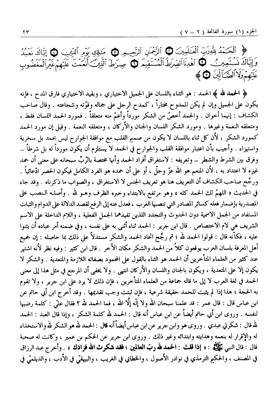 الْحَمْدُ لِلَّهِ الْحَمْدُ: هُوَ الثَّنَاءُ بِاللِّسَانِ عَلَى الْجَمِيلِ الِاخْتِيَارِيِّ، وَبِقَيْدِ الاختياري فَارَقَ الْمَدْحَ، فَإِنَّهُ يَكُونُ عَلَى الْجَمِيلِ وَإِنْ لَمْ يَكُنِ الْمَمْدُوحُ مُخْتَارًا، كَمَدْحِ الرَّجُلِ عَلَى جَمَالِهِ وَقُوَّتِهِ وَشَجَاعَتِهِ. وَقَالَ صَاحِبُ الْكَشَّافِ: إِنَّهُمَا أَخَوَانِ. وَالْحَمْدُ أَخَصُّ مِنَ الشُّكْرِ مَوْرِدًا وَأَعَمُّ مِنْهُ مُتَعَلَّقًا. فَمَوْرِدُ الْحَمْدِ اللِّسَانُ فَقَطْ، وَمُتَعَلِّقُهُ النِّعْمَةُ وَغَيْرُهَا. وَمَوْرِدُ الشُّكْرِ اللِّسَانُ وَالْجَنَانُ وَالْأَرْكَانُ، وَمُتَعَلِّقُهُ النِّعْمَةُ. وَقِيلَ إِنَّ مَوْرِدَ الْحَمْدِ كَمَوْرِدِ الشُّكْرِ، لِأَنَّ كُلَّ ثَنَاءٍ بِاللِّسَانِ لَا يَكُونُ مِنْ صَمِيمِ الْقَلْبِ مَعَ مُوَافَقَةِ الْجَوَارِحِ لَيْسَ بِحَمْدٍ بَلْ سُخْرِيَةٌ وَاسْتِهْزَاءٌ. وَأُجِيبُ بِأَنَّ اعْتِبَارَ مُوَافَقَةِ الْقَلْبِ وَالْجَوَارِحِ فِي الْحَمْدِ لَا يَسْتَلْزِمُ أَنْ يَكُونَ مَوْرِدًا لَهُ بَلْ شَرْطًا- وَفَرْقٌ بَيْنَ الشَّرْطِ وَالشَّطْرِ- وَتَعْرِيفُهُ: لِاسْتِغْرَاقِ أَفْرَادِ الْحَمْدِ وَأَنَّهَا مُخْتَصَّةٌ بِالرَّبِّ سُبْحَانَهُ عَلَى مَعْنَى أَنَّ حَمْدَ غَيْرِهِ لَا اعْتِدَادَ بِهِ، لِأَنَّ الْمُنْعِمَ هُوَ اللَّهُ عَزَّ وَجَلَّ، أَوْ عَلَى أَنَّ حَمْدَهُ هُوَ الْفَرْدُ الْكَامِلُ فَيَكُونُ الْحَصْرُ ادِّعَائِيًّا.